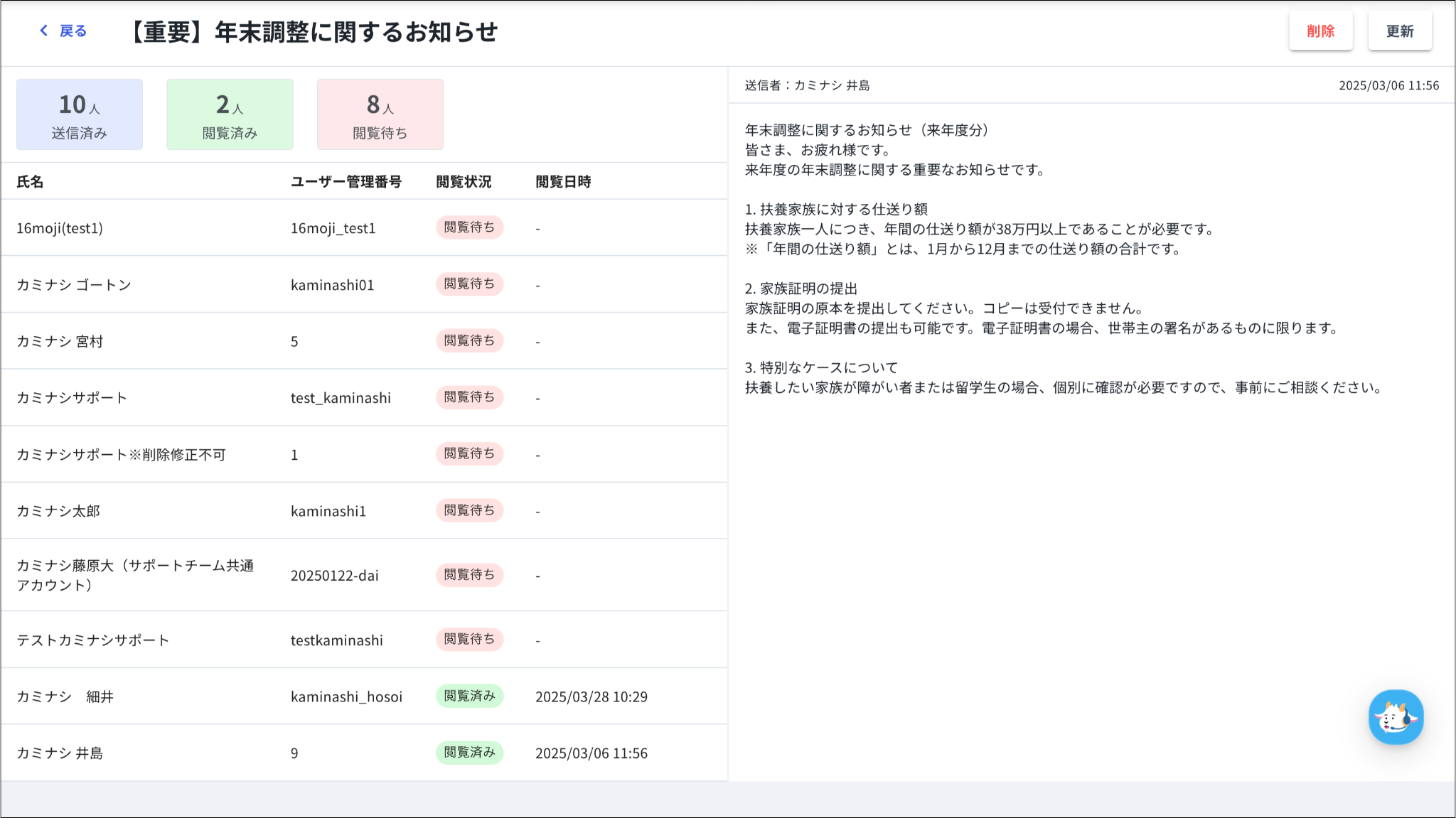 今回のリリースより、管理画面でお知らせの詳細画面を開くと、その操作を行ったご自身のユーザーについて、当該お知らせが「閲覧済み」として自動的に記録されるようになりました。