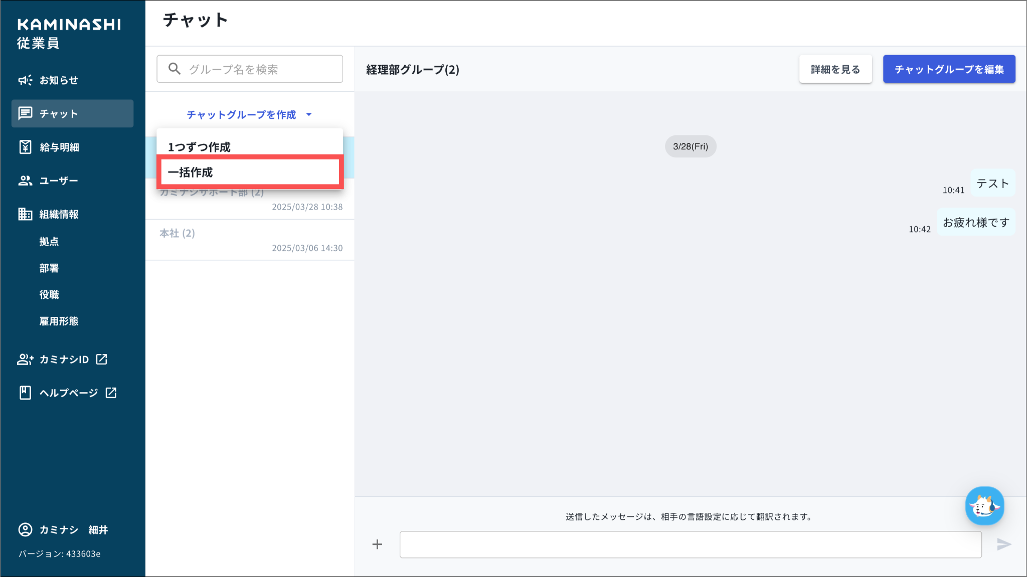 一括作成の詳細については「従業員とのチャットグループを一括作成する」をご参照ください。