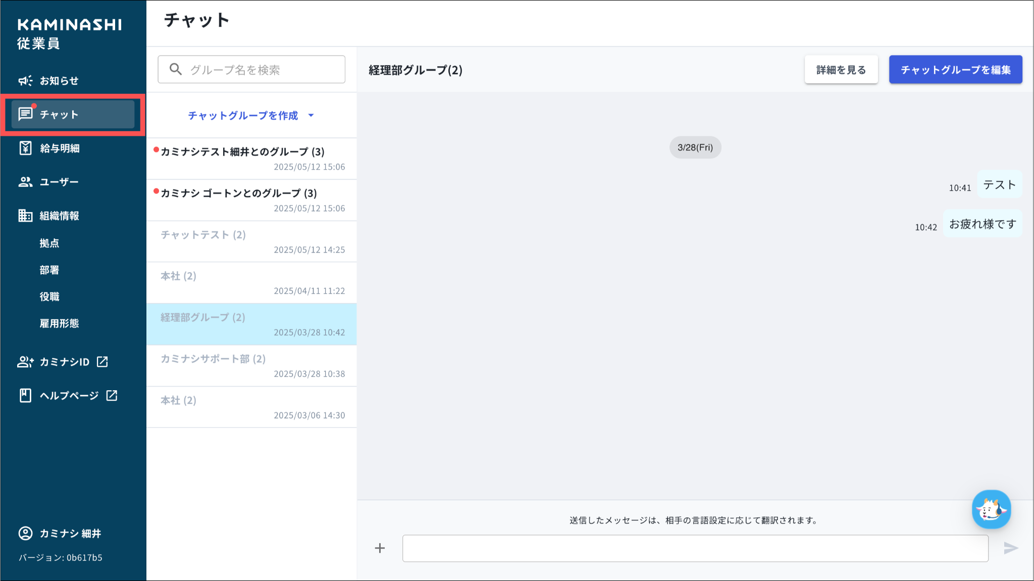 自身が所属しているチャットグループで未読のものが1つ以上ある場合、メニュー上のチャットタブに未読マークが表示されます。