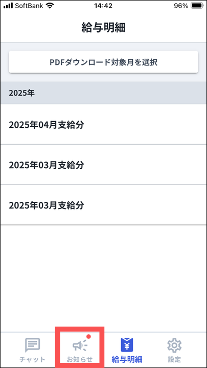 自身が含まれて配信されたお知らせで未読のものが1つ以上ある場合、メニュー上のお知らせタブに未読マークが表示されます。