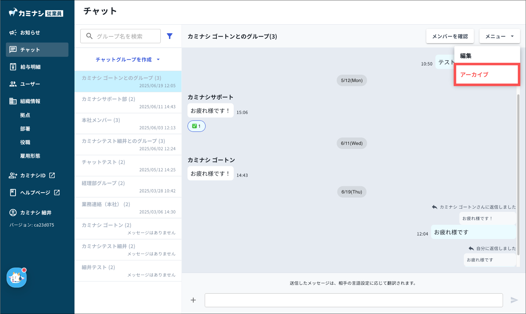 チャットグループのアーカイブ方法については、「管理画面でチャットグループをアーカイブする」、「Myカミナシでチャットグループをアーカイブする」をご参照ください。