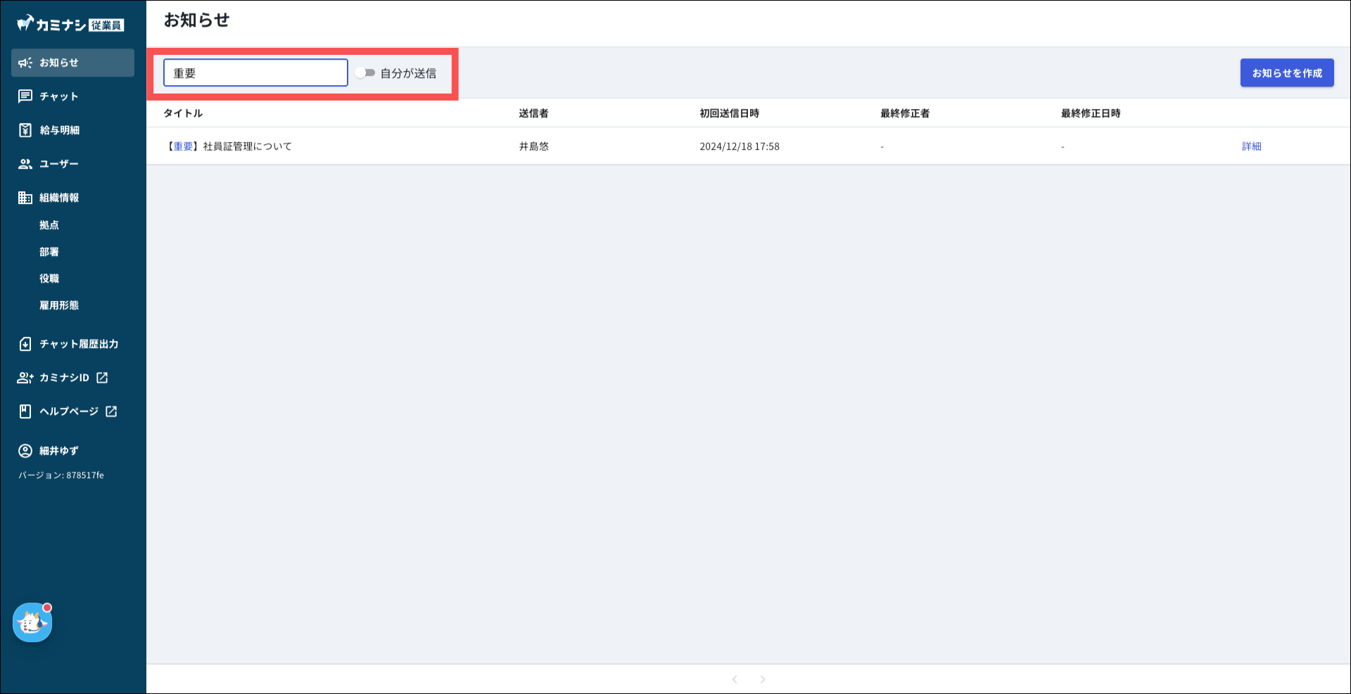 「自分が送信」の絞り込みでは、「送信者」がご自身のお知らせのみが絞り込み対象となります。「最終修正者」は対象外となりますのでご注意ください。