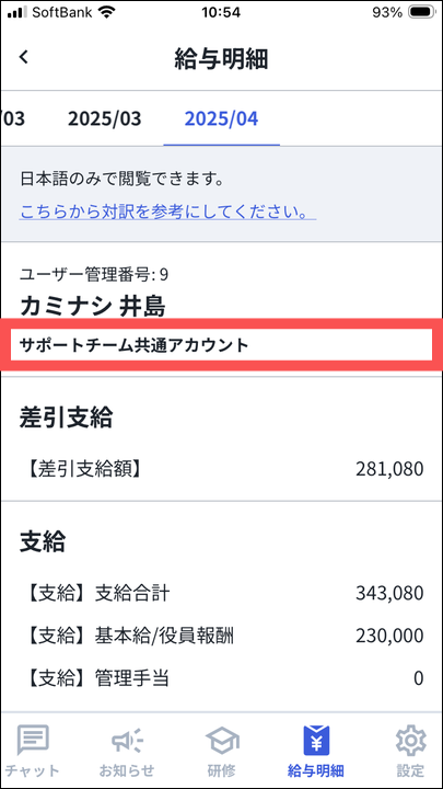 これまで、Myカミナシで給与明細を開くとユーザー名の下に「拠点」「部署」「役職」「雇用形態」といった組織情報が表示されておりましたが、今回のリリースにより非表示になります。