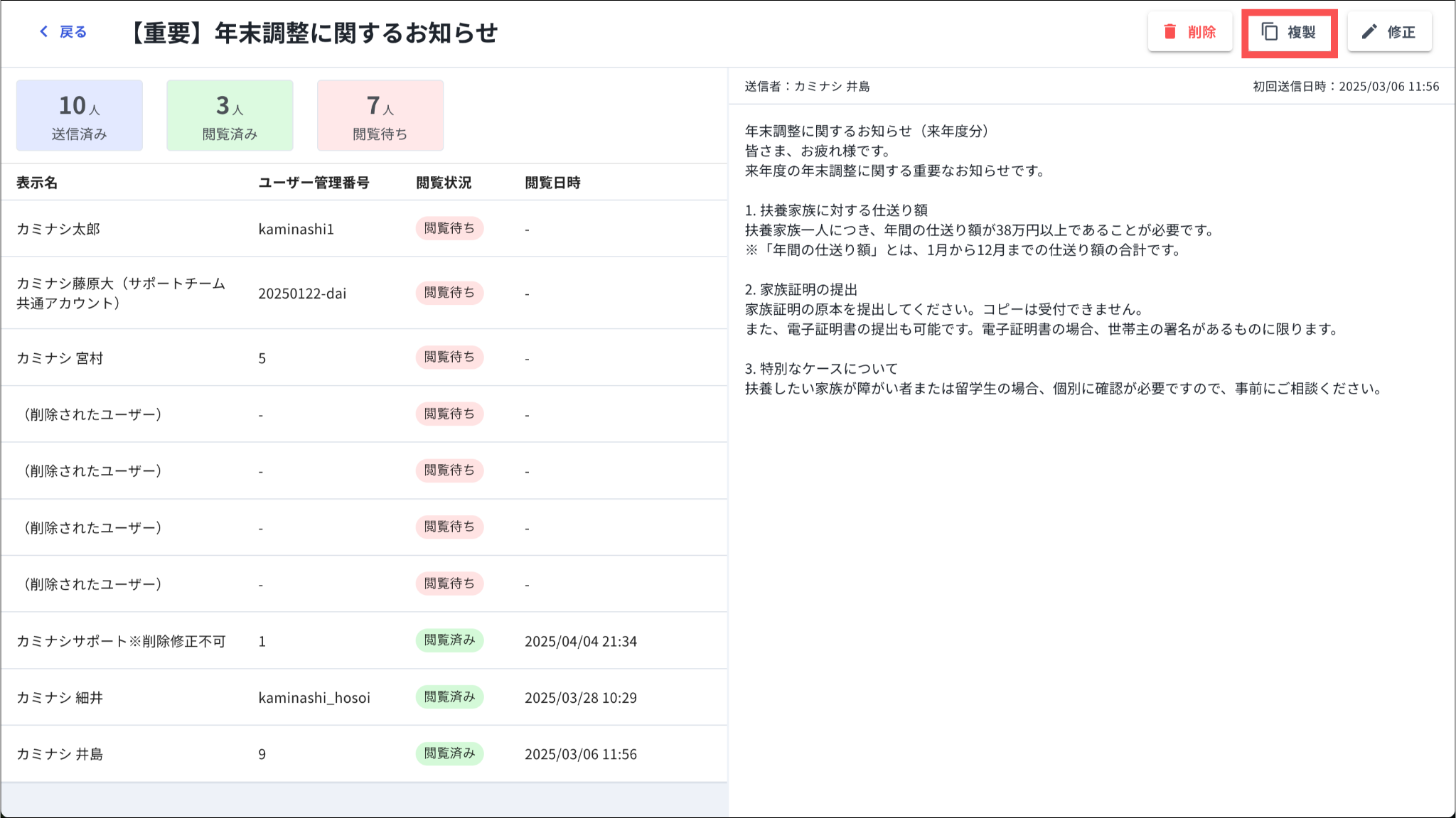 複製したお知らせを送信後は、通常のお知らせ同様Myカミナシに通知されます。