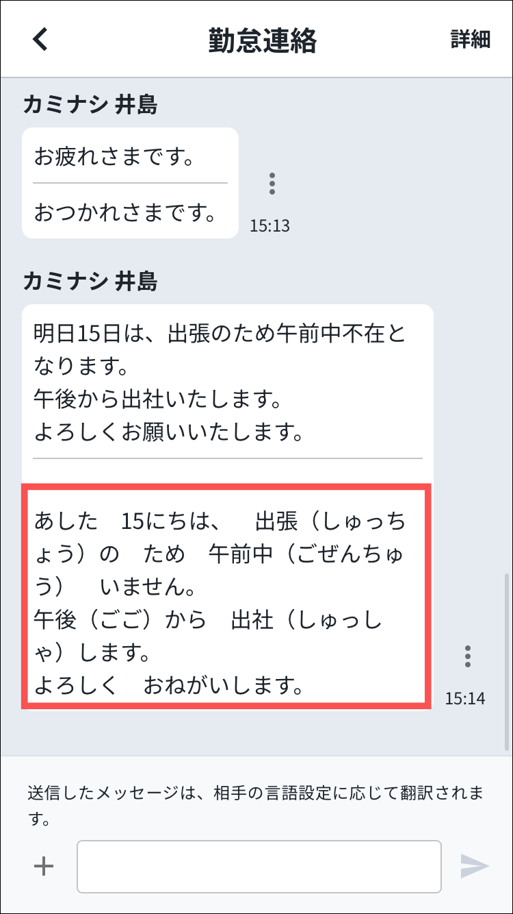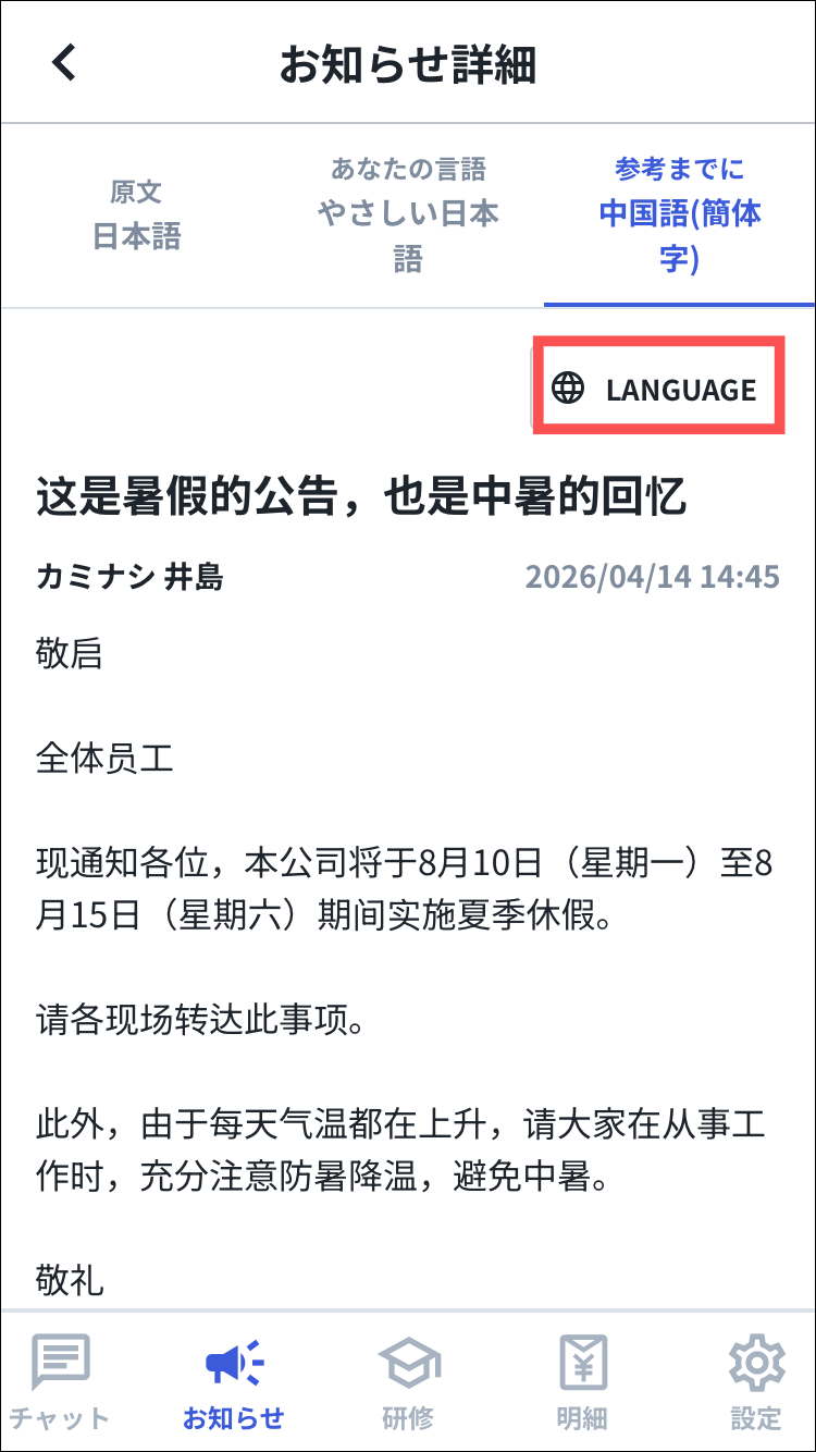 これにより、外国人従業員の方々が在籍する現場においても、個々の言語習得状況に合わせてお知らせを確認できるようになります。