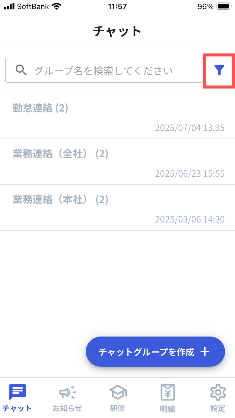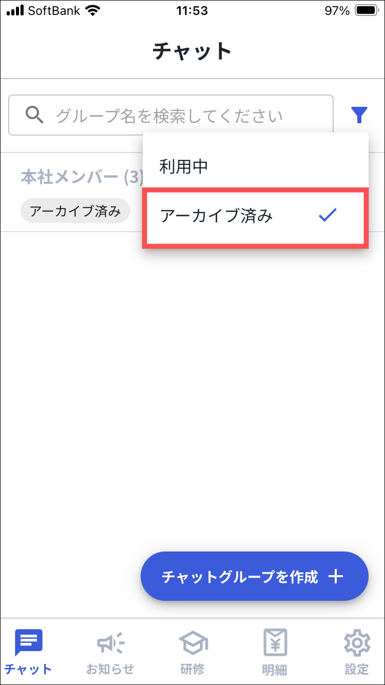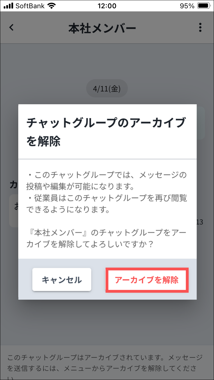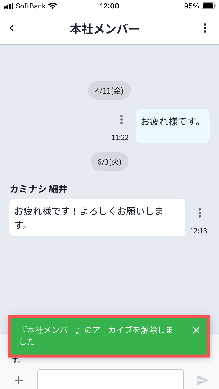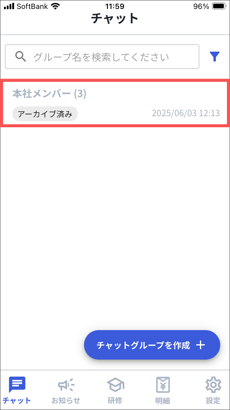 1.Myカミナシにログインする2.「チャット」を開き、検索窓横にあるアイコンを押す3.「アーカイブ済み」を押す※ロールが「管理者」「現場担当者」のユーザーのみ表示されます。4.アーカイブを解除するチャットグループを押す5.「︙」を押す6.「アーカイブを解除」を押す7.注意事項を確認し、「アーカイブを解除」を押す8.「{チャットグループ名}のアーカイブを解除しました」と表示されるよくある質問は、こちらからご確認ください。