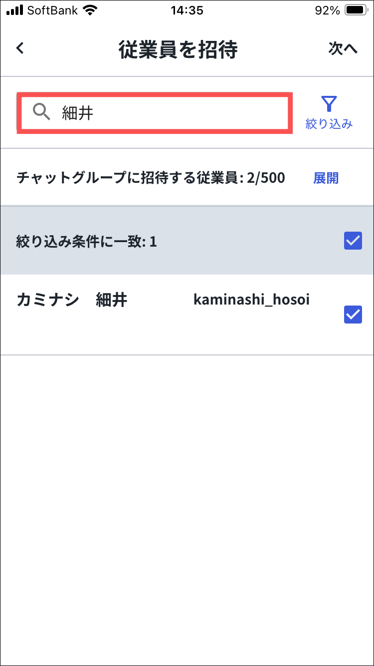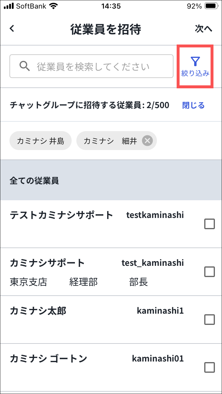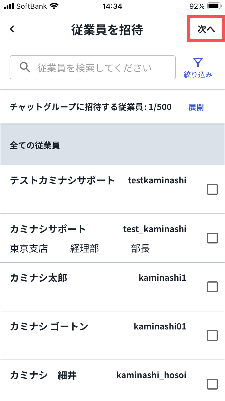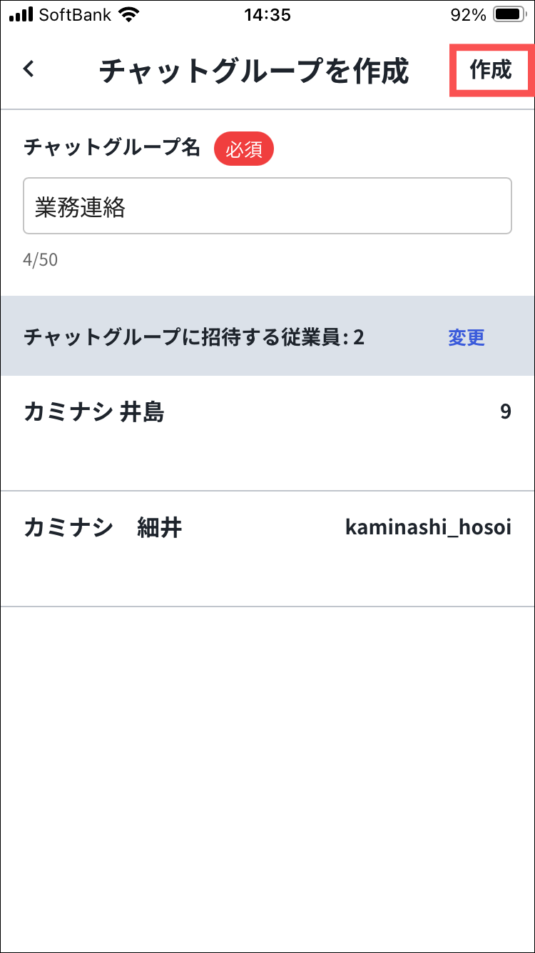 従業員名横の「✕」を押すと、選択した従業員をチャットグループから外すことができます。
