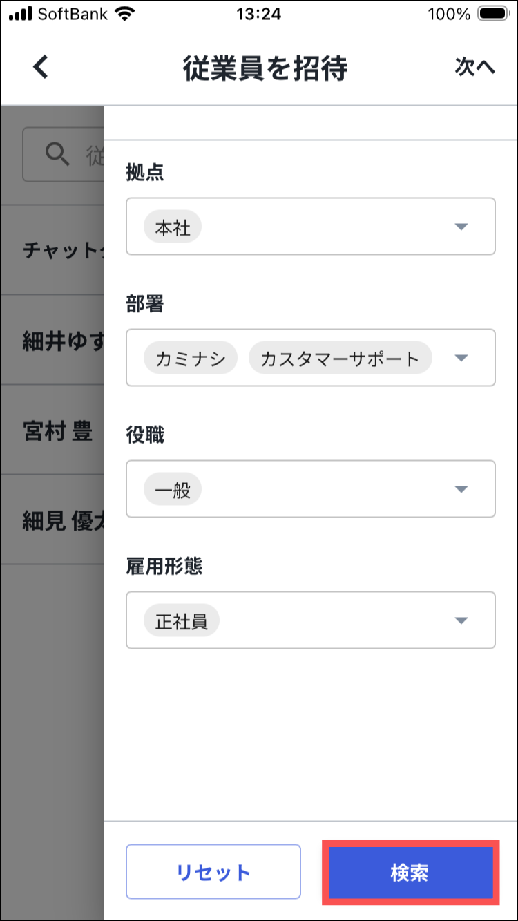 従業員が表示されない場合は、組織情報の絞り込みをリセットして再度検索してください。
