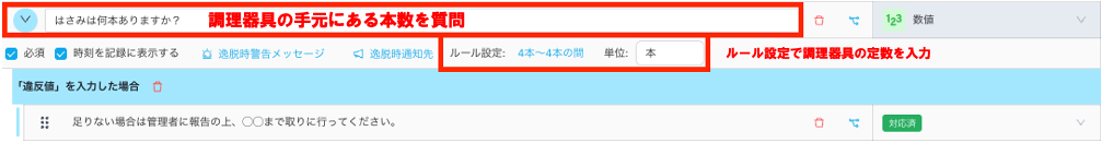 その後、「数値・ルール設定」で調理器具の「必要本数」を入力する。