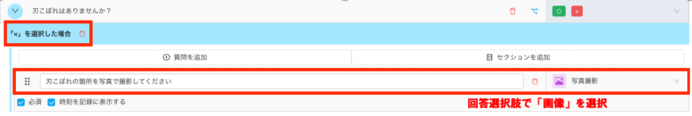 最後に回答選択肢で「画像」を選択すると、従業員がiPadで回答の際、カメラで刃の状態を撮影することができます。
