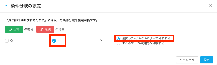 「✕」にチェックを入れて、「選択したそれぞれの項目で分岐する」を選択します。