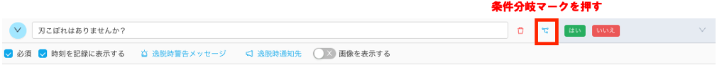 「刃こぼれ・刃先に欠けがないか」質問を行い「✕」が押された時にだけ、従業員に画像を撮らせるようにすることが可能です。