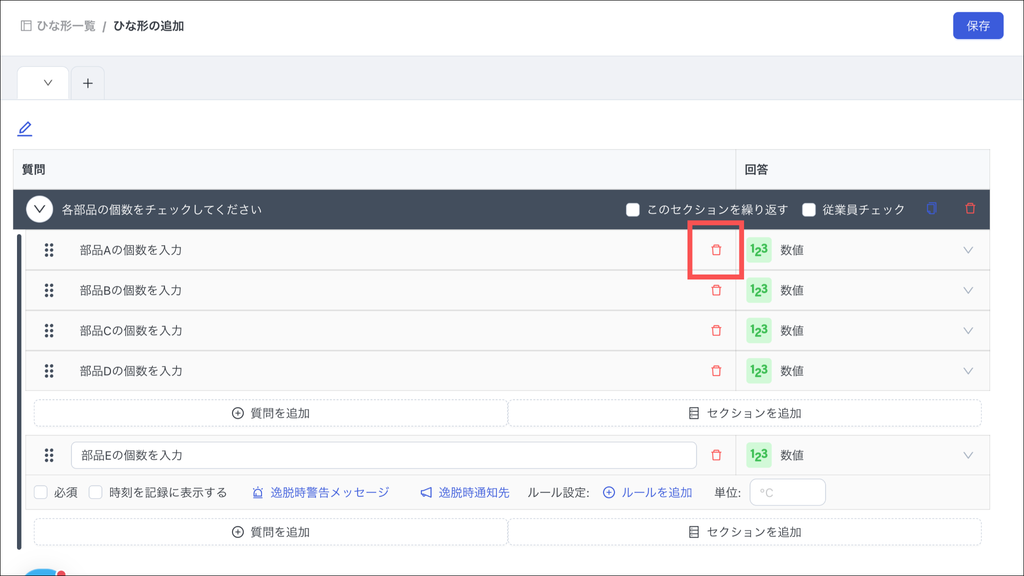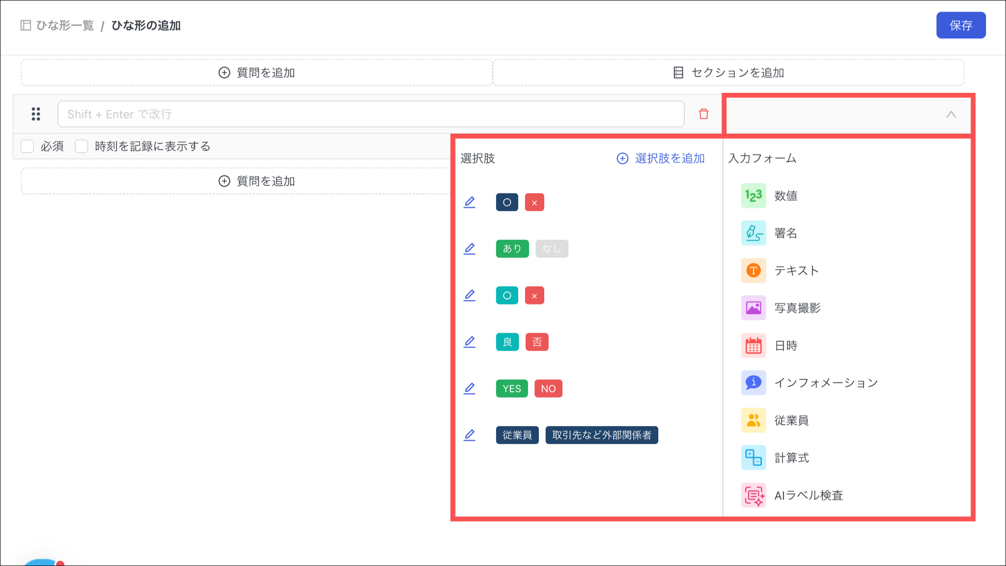 上の行に質問がある場合、「質問を追加」を押すと、「回答形式」「必須」「時刻を記録に表示する」「逸脱時通知先」は上の行と同じ設定になります。