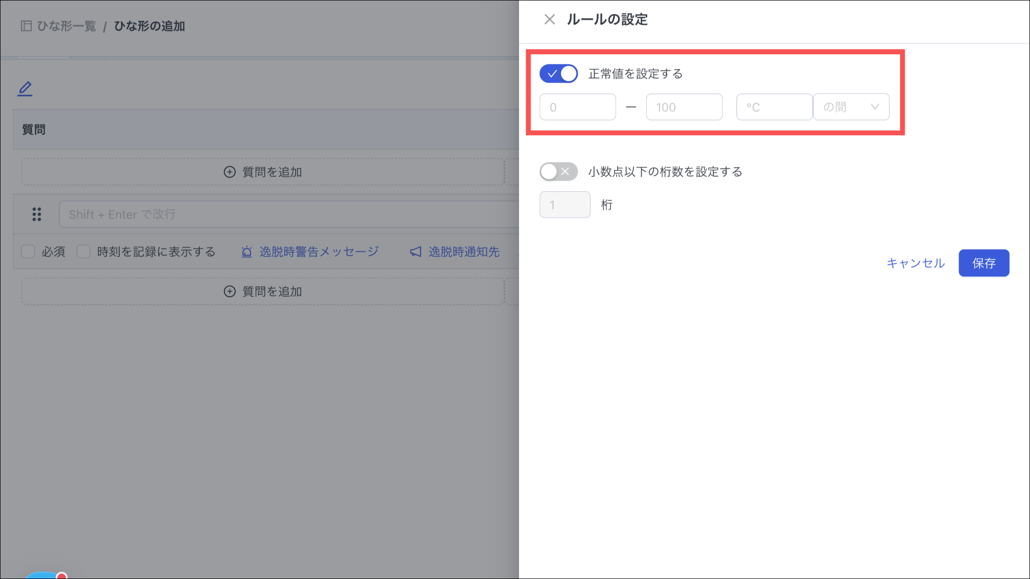 逸脱回答に対してエラーメッセージを表示し、管理者にメール通知をすることができます。なお、逸脱は回答形式「選択肢」又は「数値」のみ設定できます。