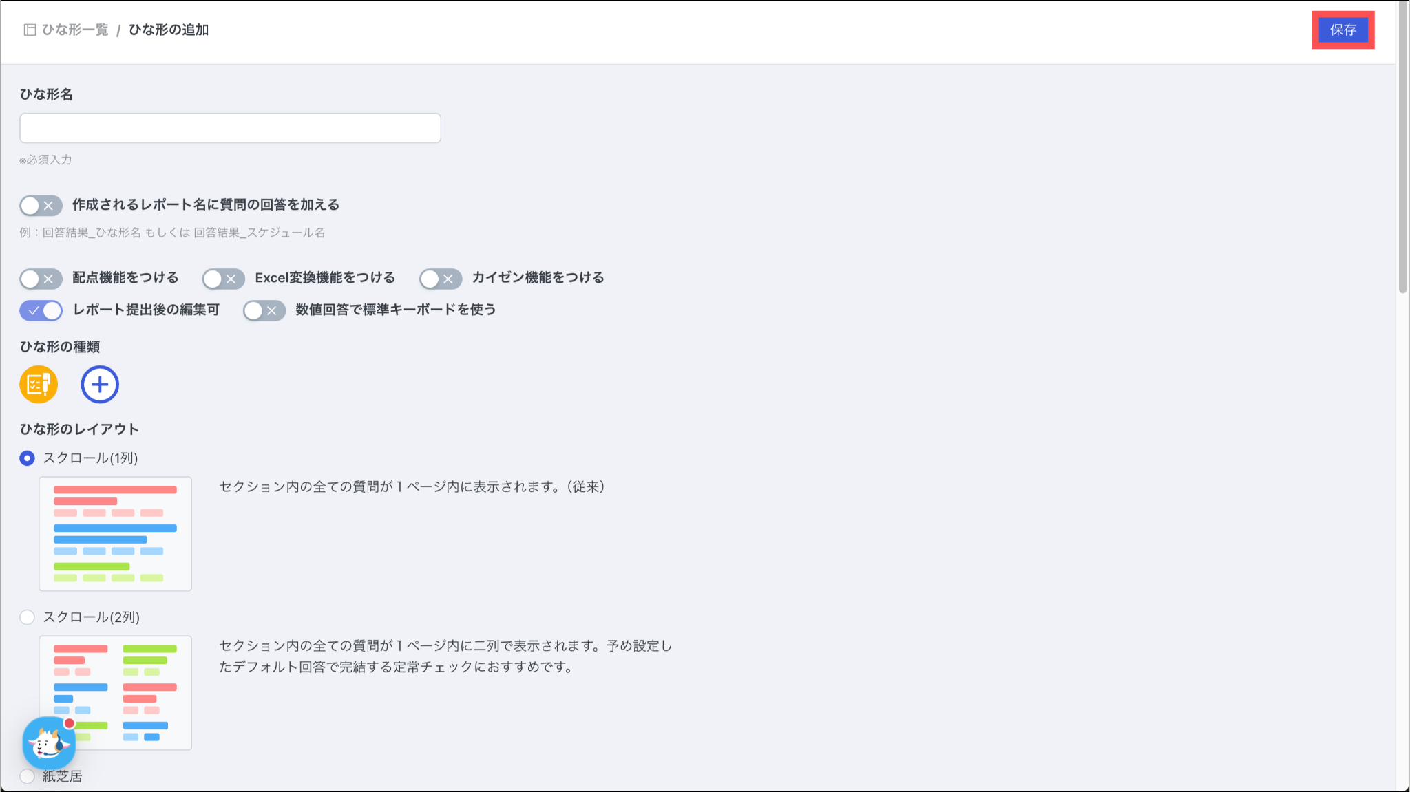 ひな形を新規作成する方法は、「ひな形のオプション、レイアウトを設定する」をご参照ください。