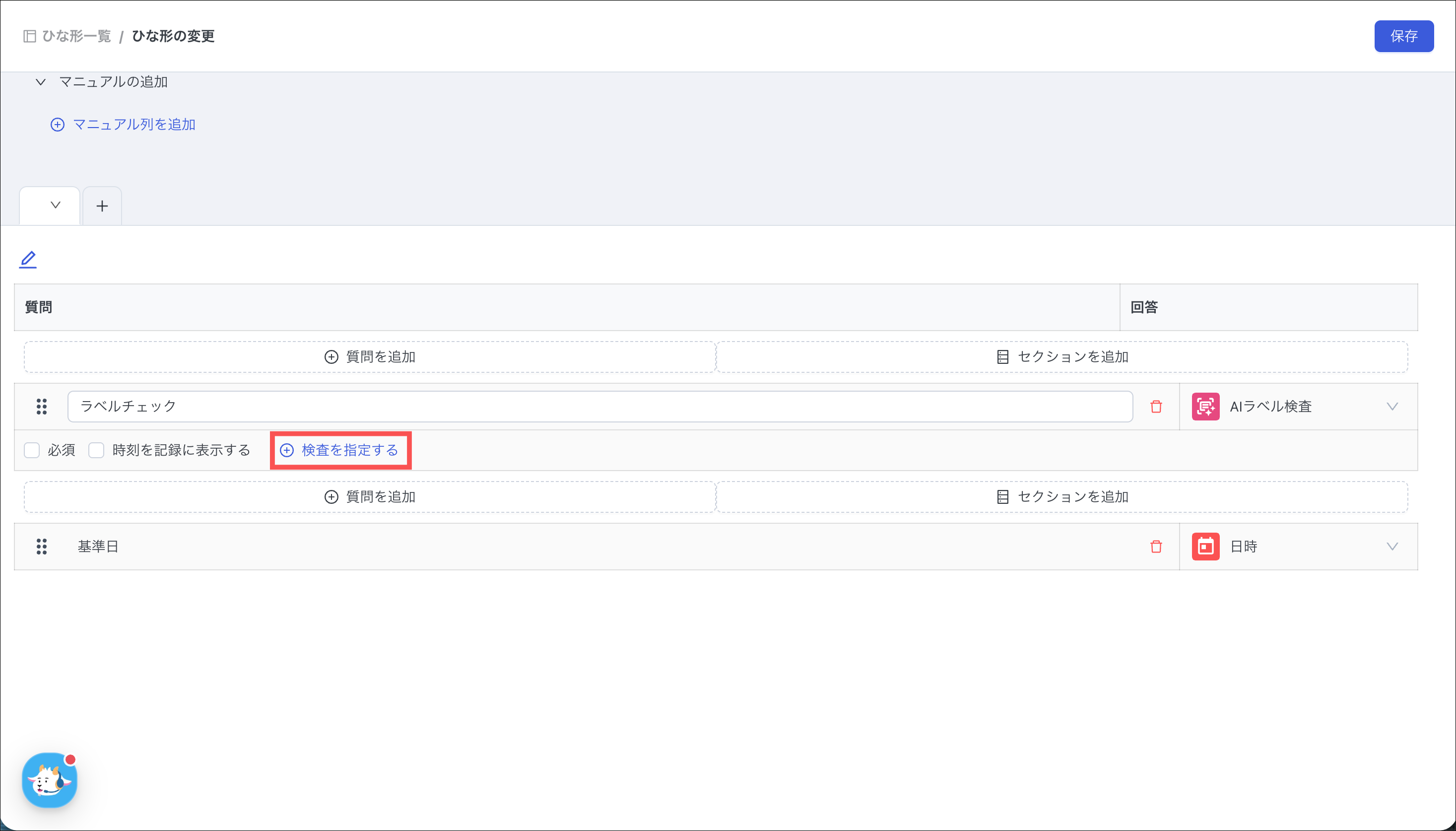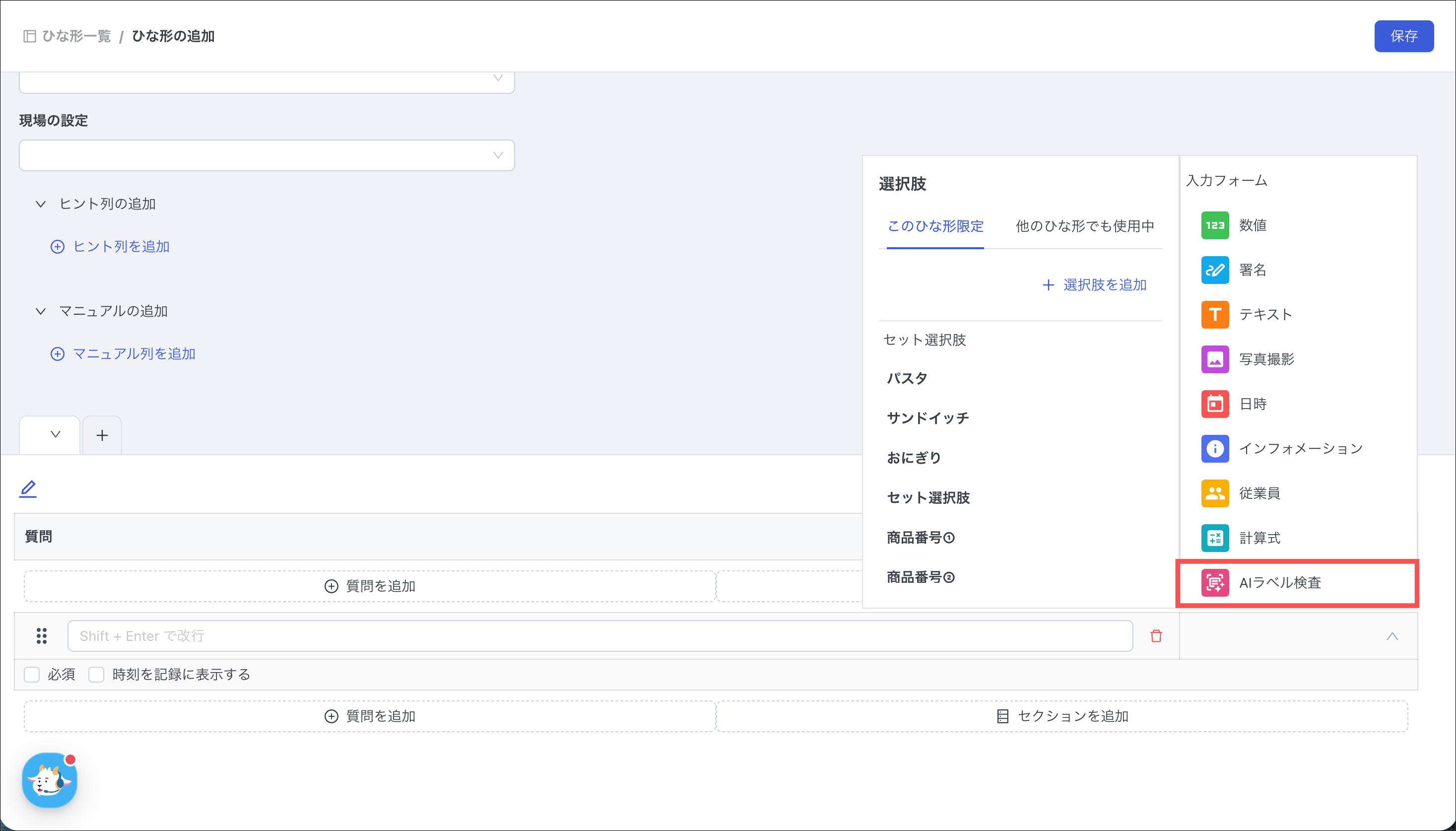 必ず同じひな形内の同一セクション、かつ同一の条件分岐元の中に、回答形式が「AIラベル検査」の質問を作成してください。