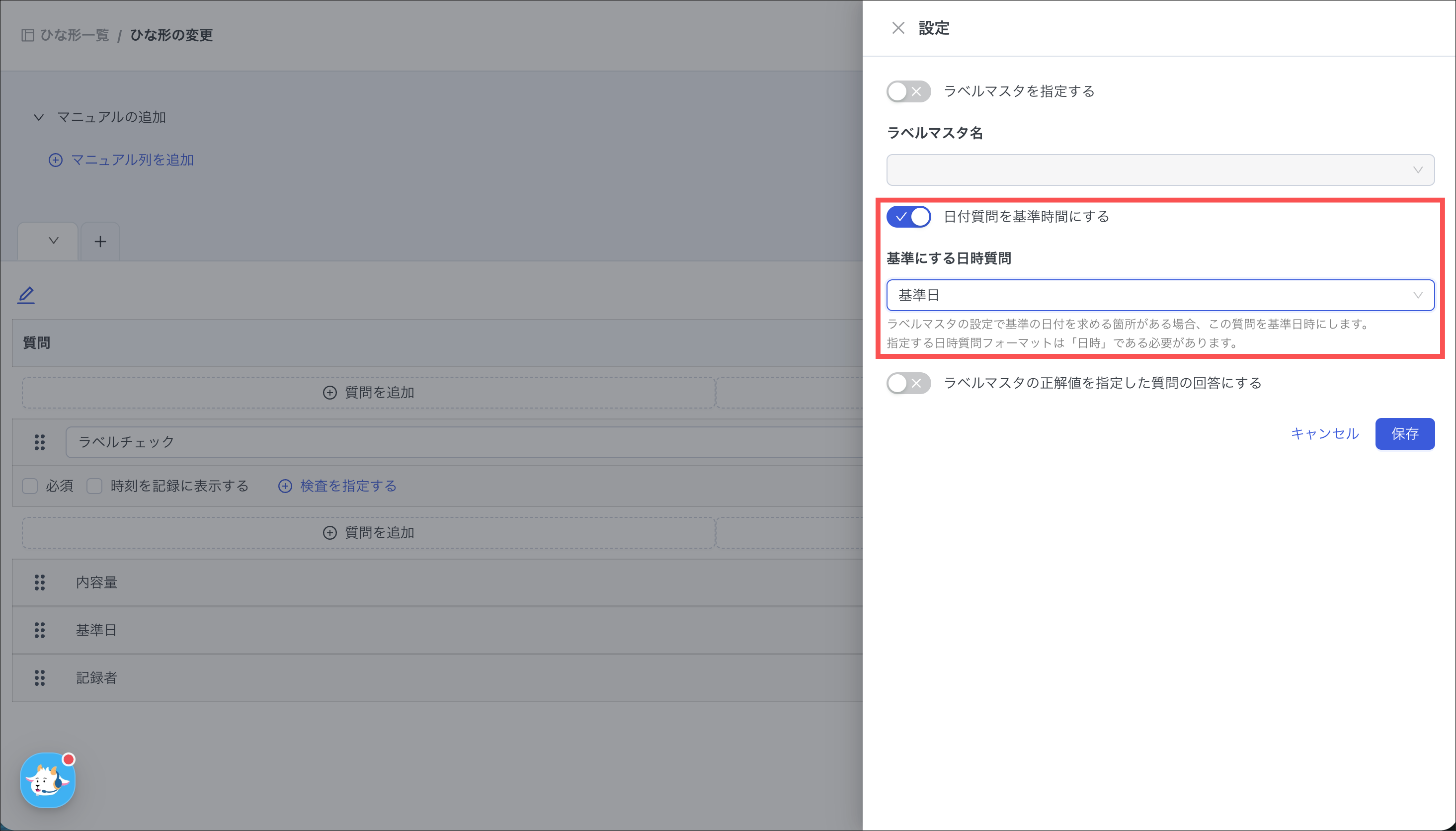 検査箇所の一致タイプが「レポートアプリで基準日時を選択する」または「レポートアプリで基準日時を選択して、以下より未来かを判定」の場合、「3.「質問を追加」を押し、検査基準となる質問を作成する」で作成した質問を選択し、「保存」を押します。