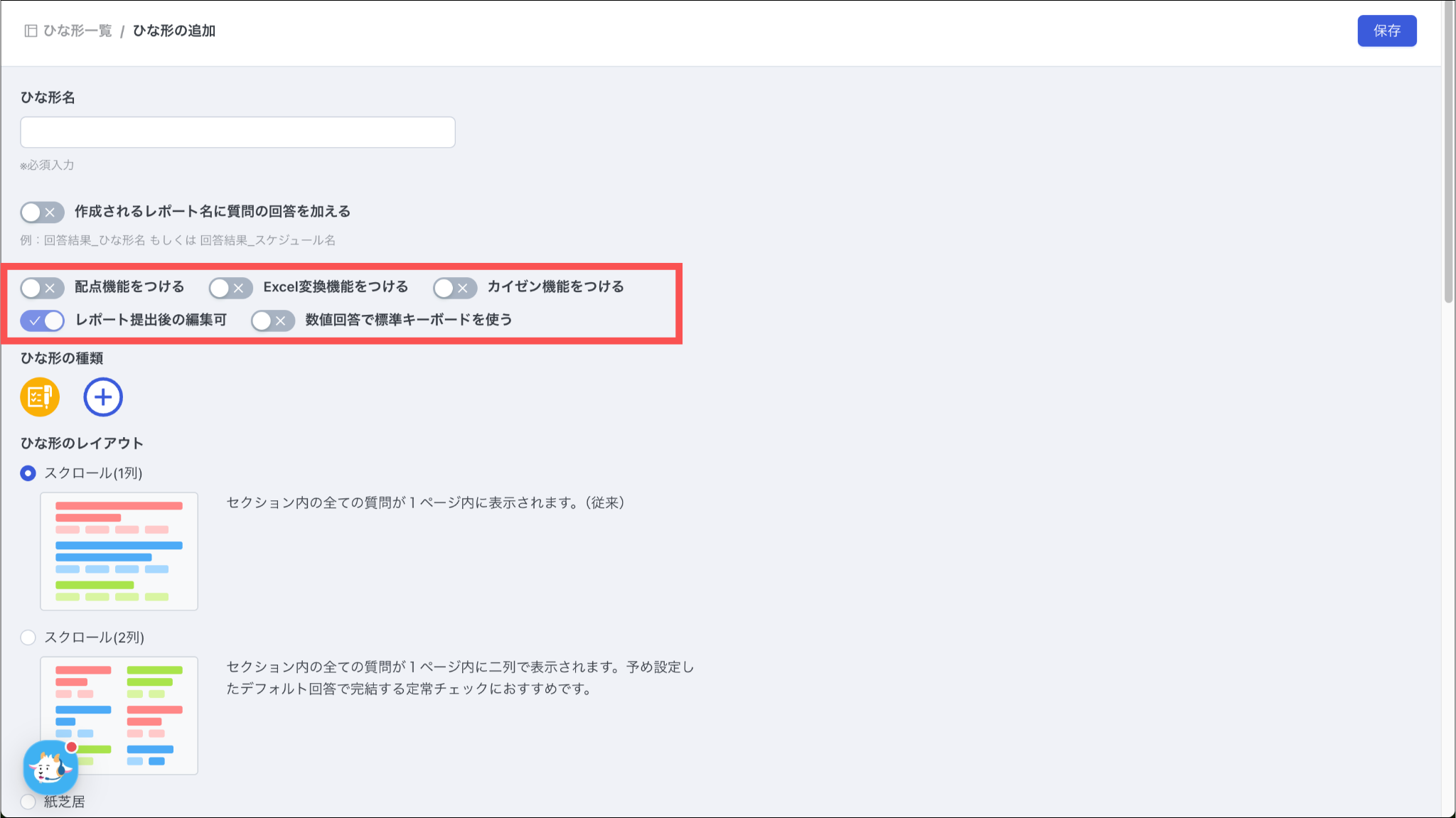 一部のプランを除き、こちらをオンにすることで、ひな形を「カイゼン機能」で利用できるようになります。