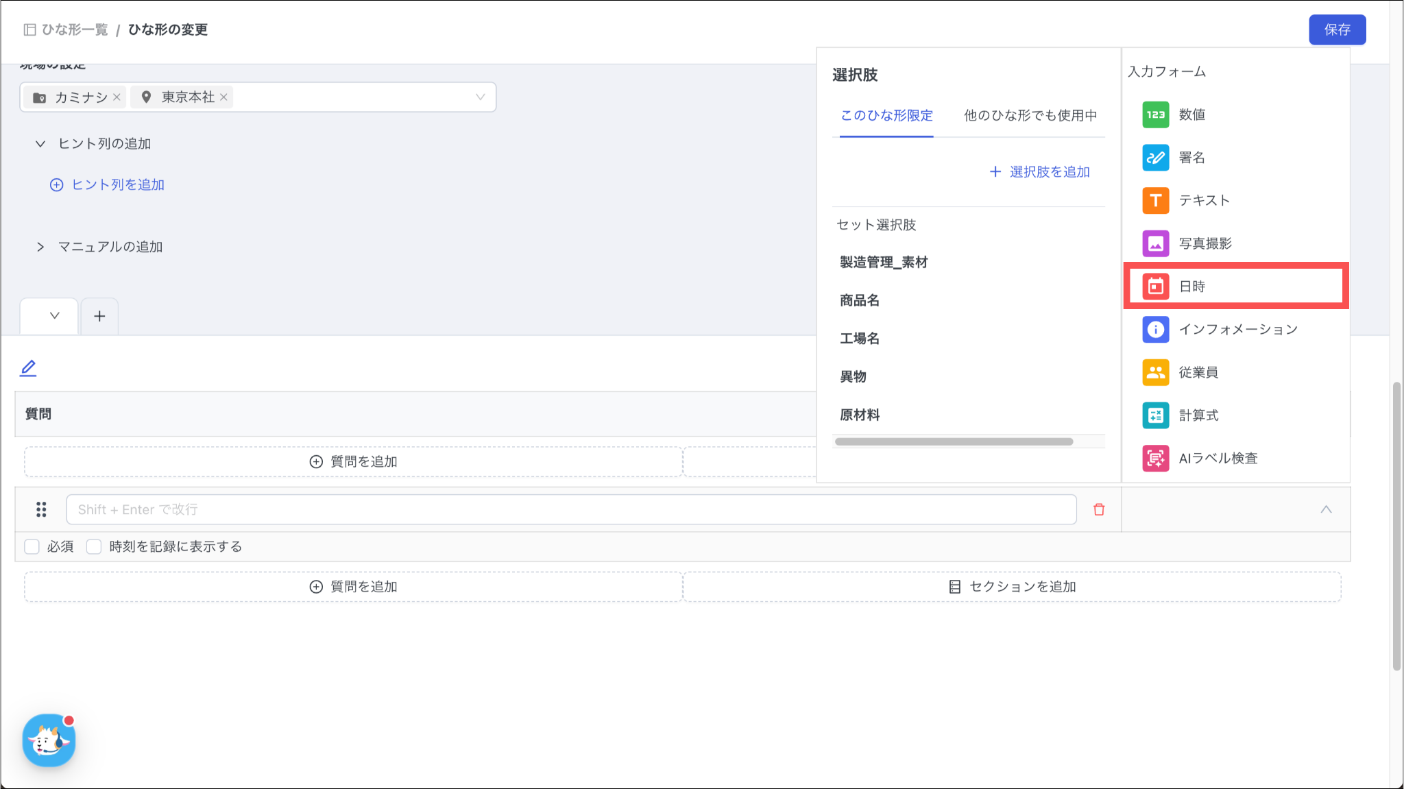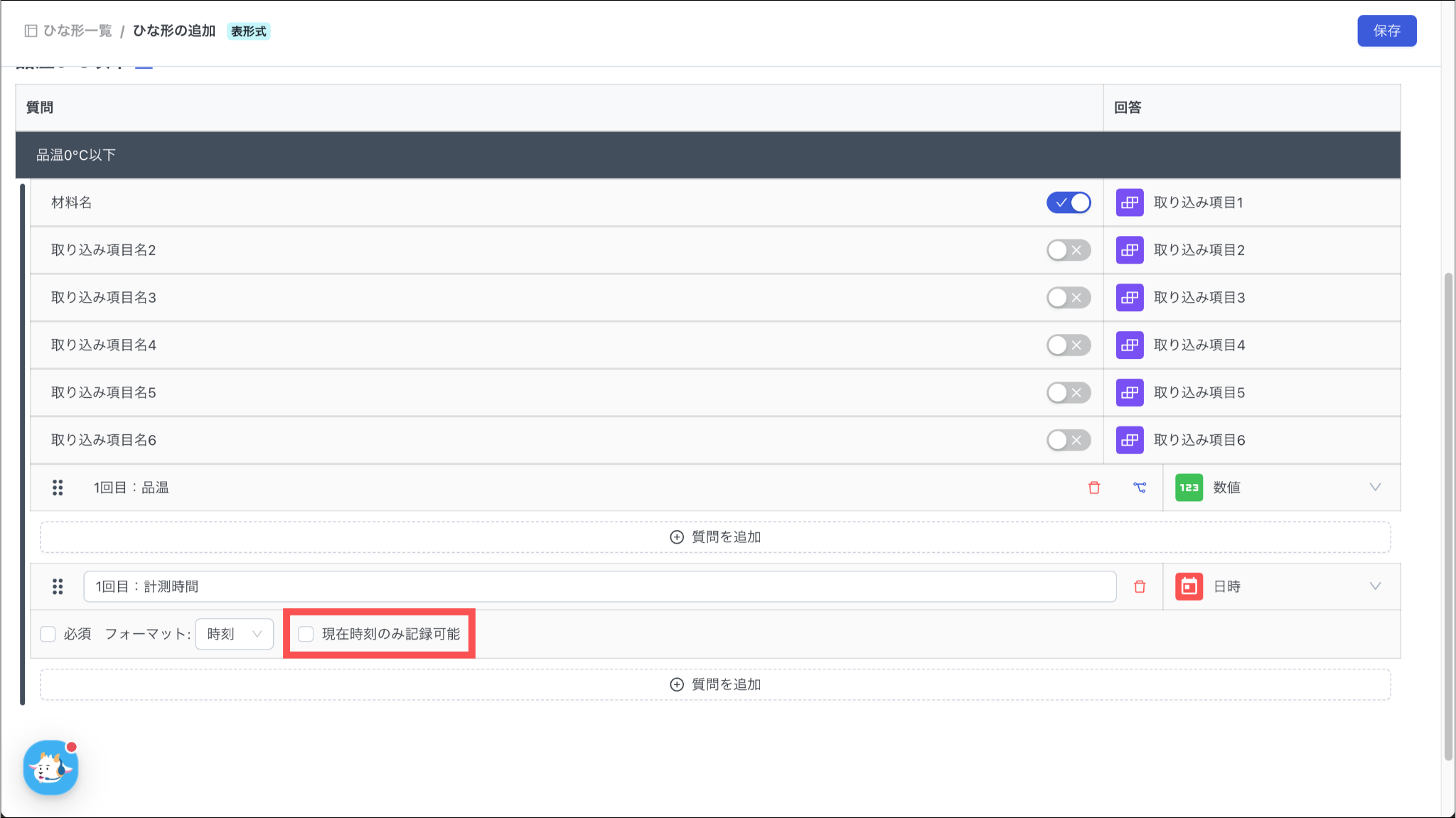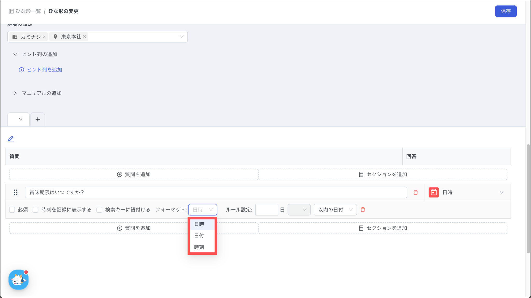 なお、この設定は表形式のひな形でフォーマットが「日時」または「時刻」を選んでいる場合のみご利用いただけます。