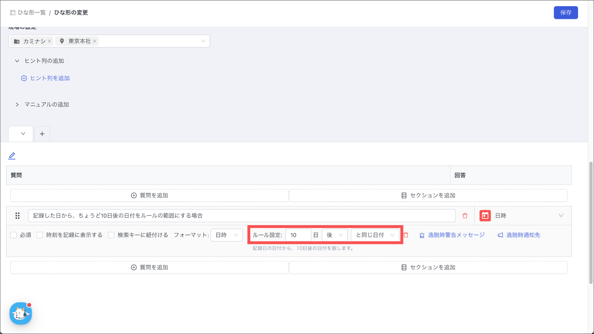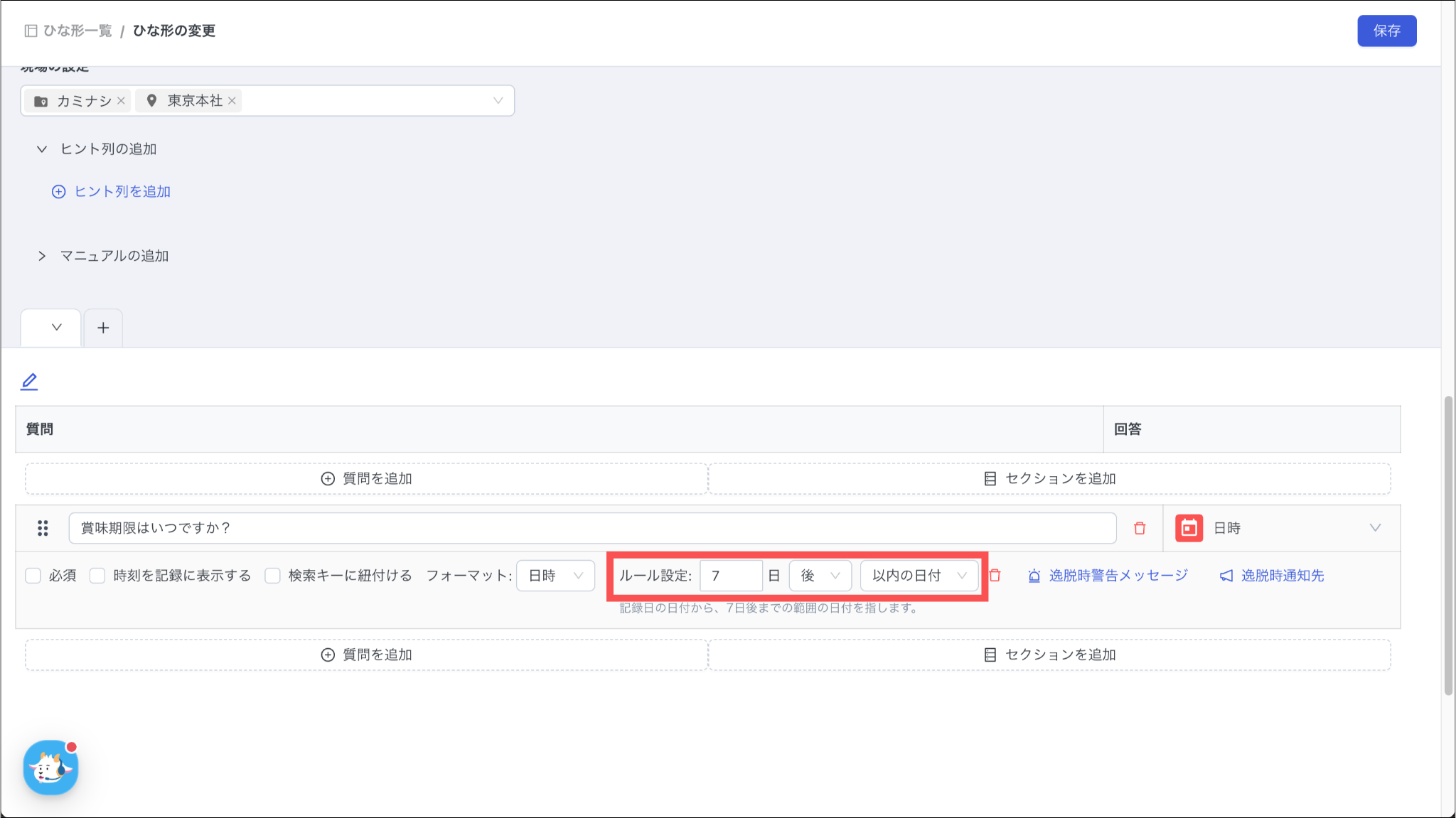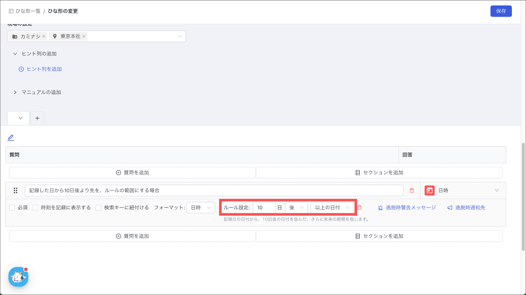 フォーマットで「日付」または「日時」を選択した場合、ルール設定をすることができます。