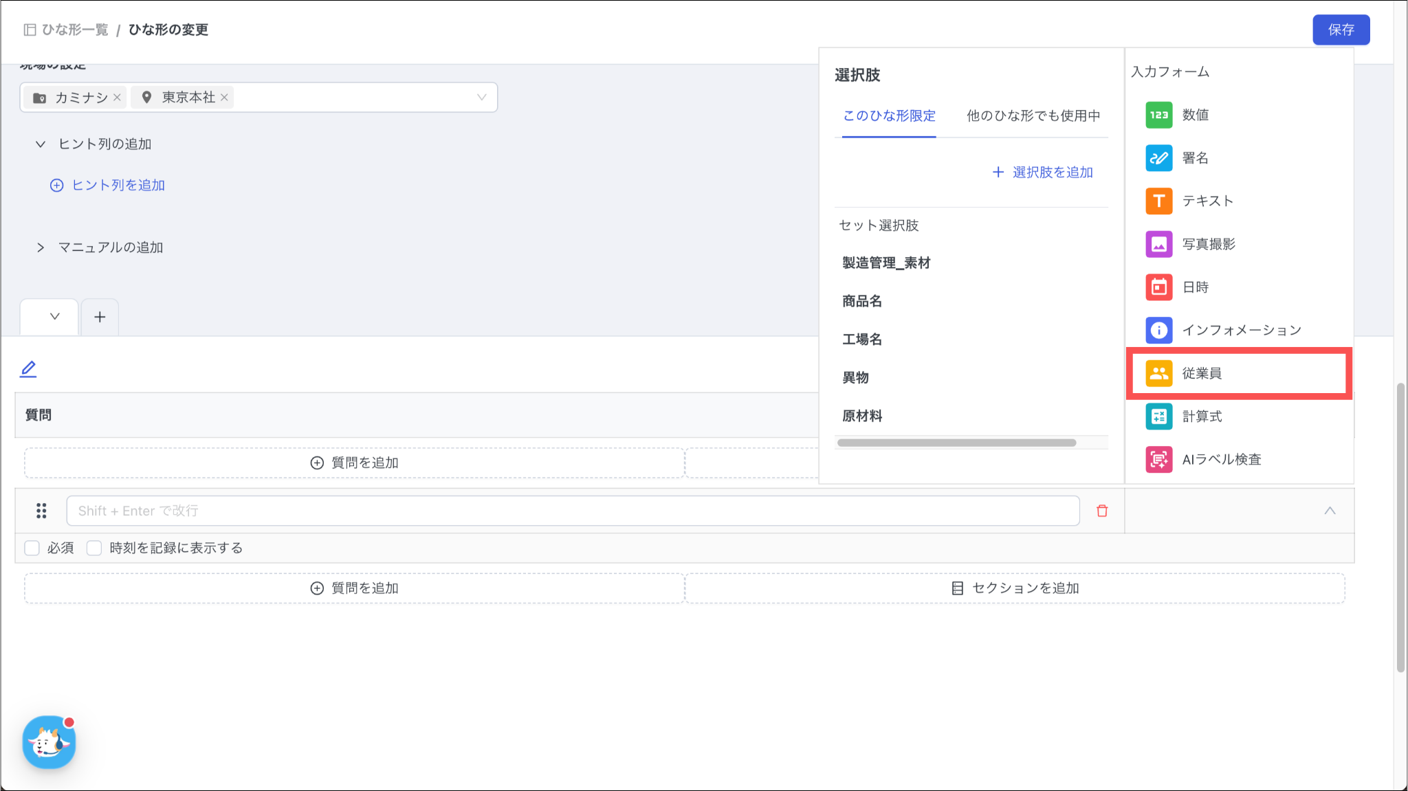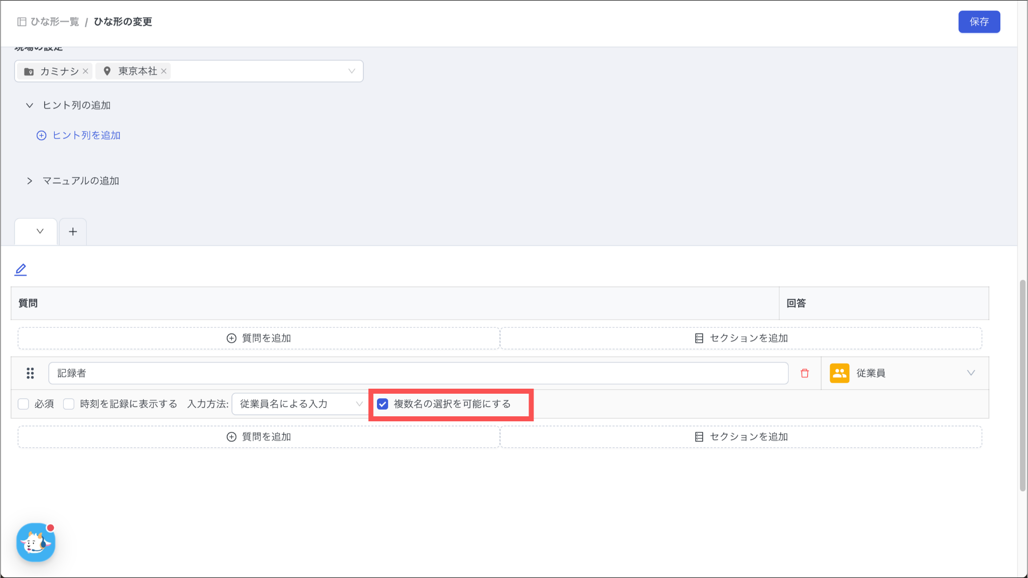 「□複数名の選択を可能にする」にチェックをいれると、記録アプリで入力をするときに、従業員をまとめて何名か選択できます。