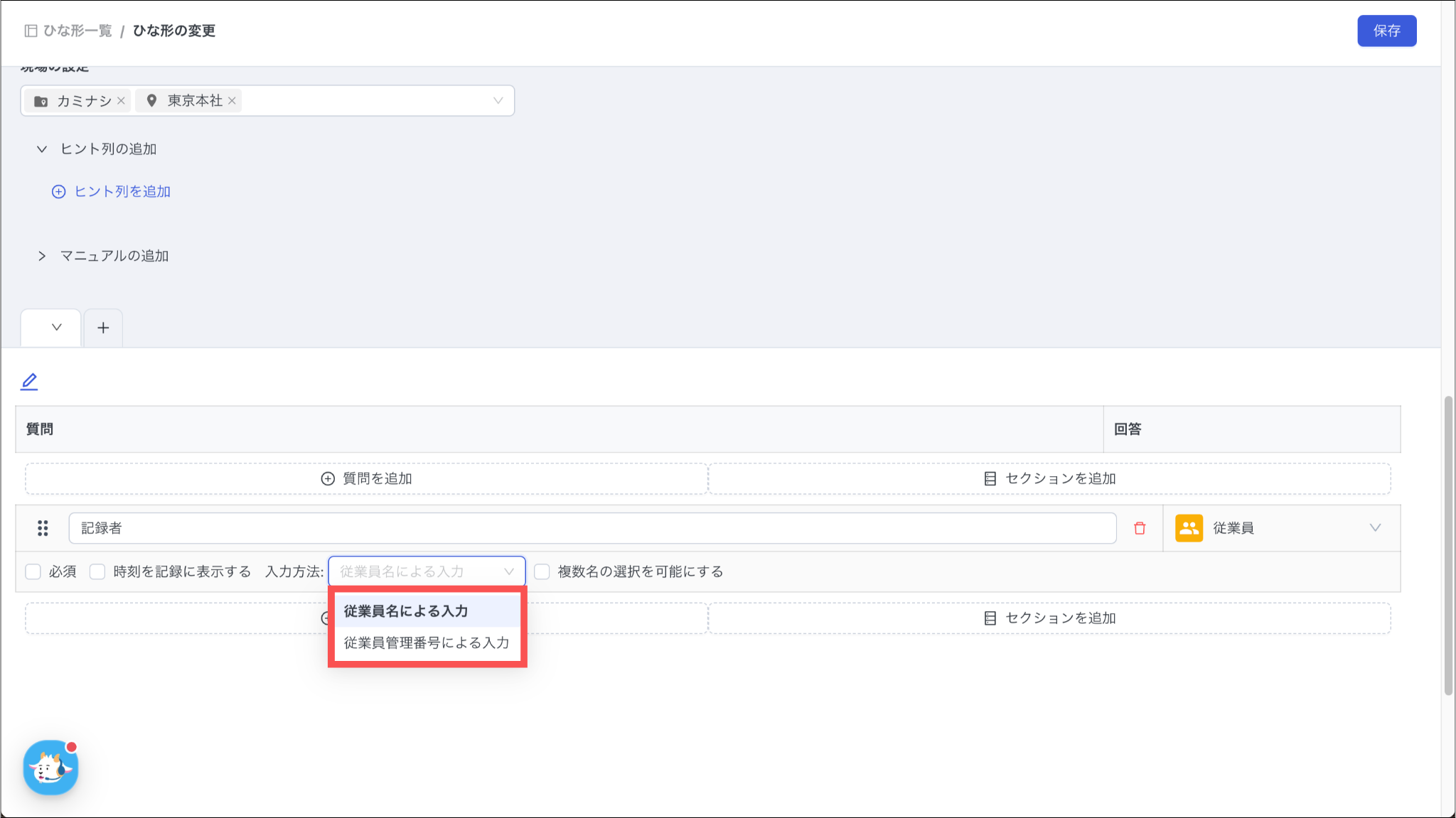 記録アプリで入力するときに、「従業員名」と「従業員管理番号」のどちらを使って入力するかを指定できます。