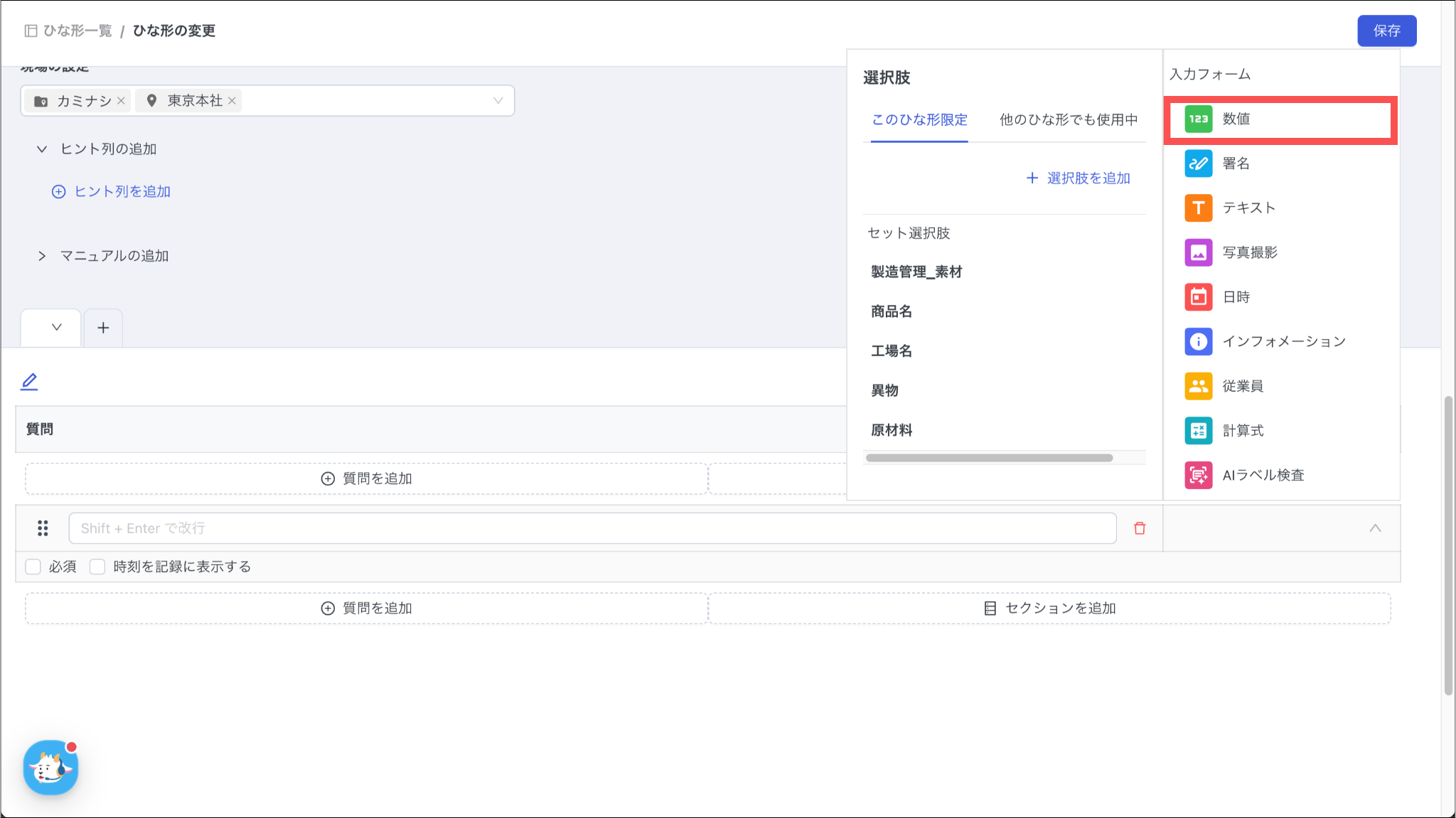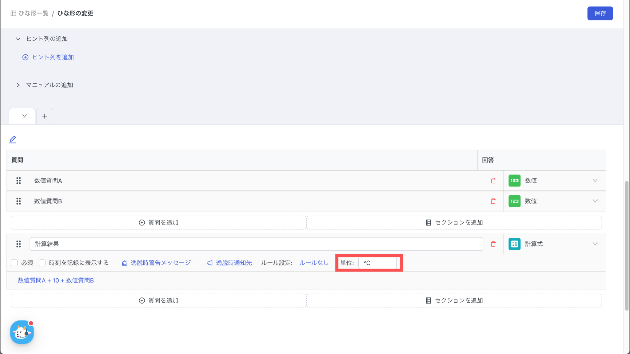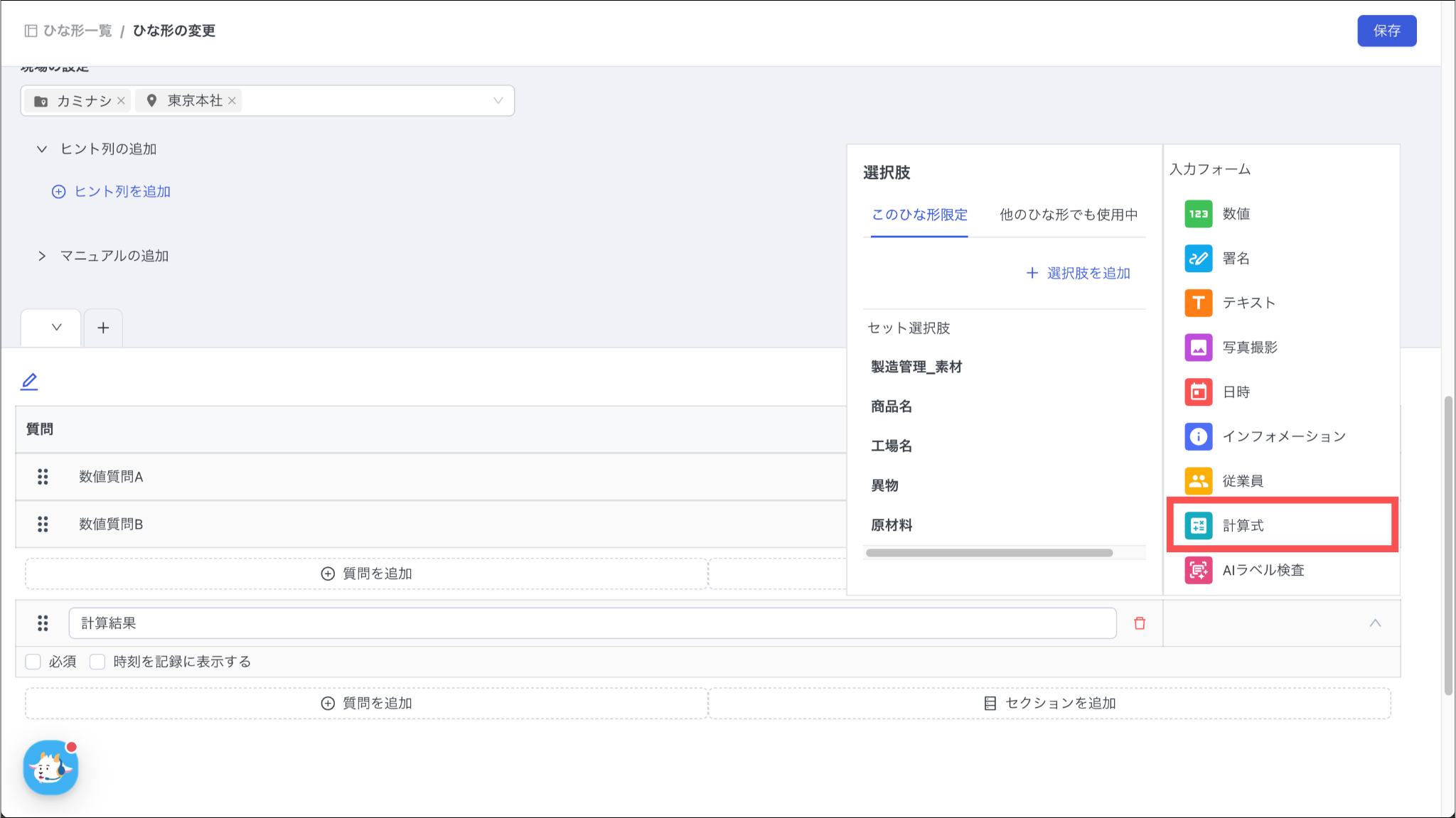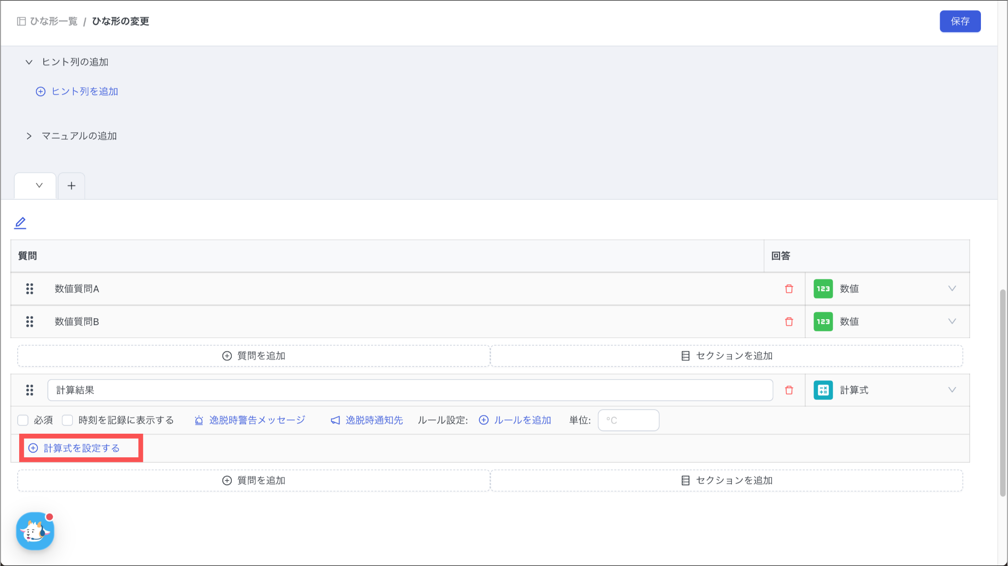計算式の設定には、回答形式「数値」の質問を1つ以上設定する必要があります。