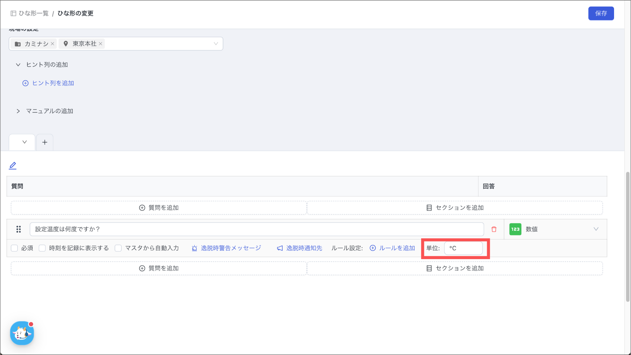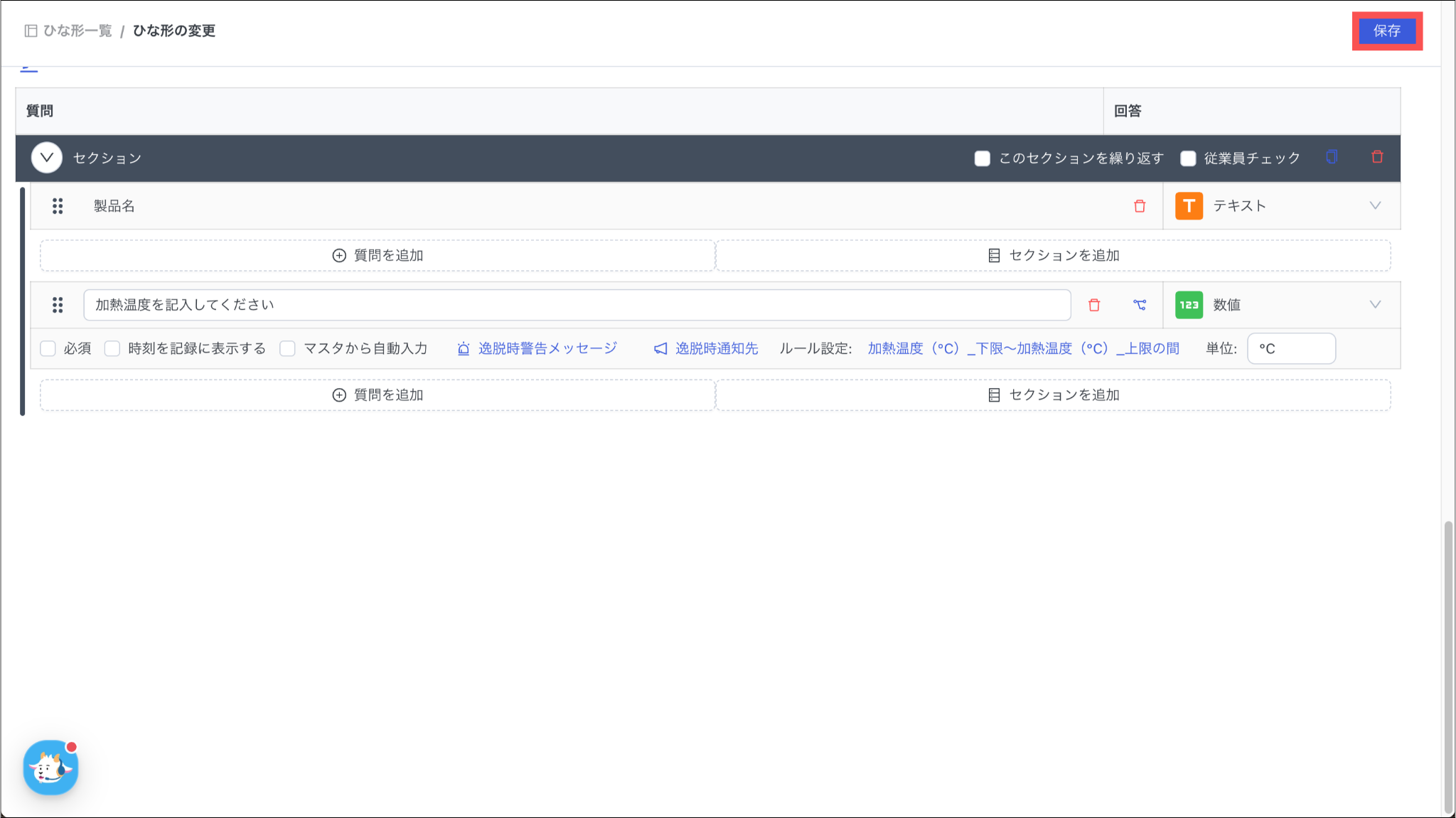 ルール逸脱時時警告メッセージや逸脱時通知先の設定については、「ひな形に質問を作成する:6.逸脱時の設定を行う」をご参照ください。