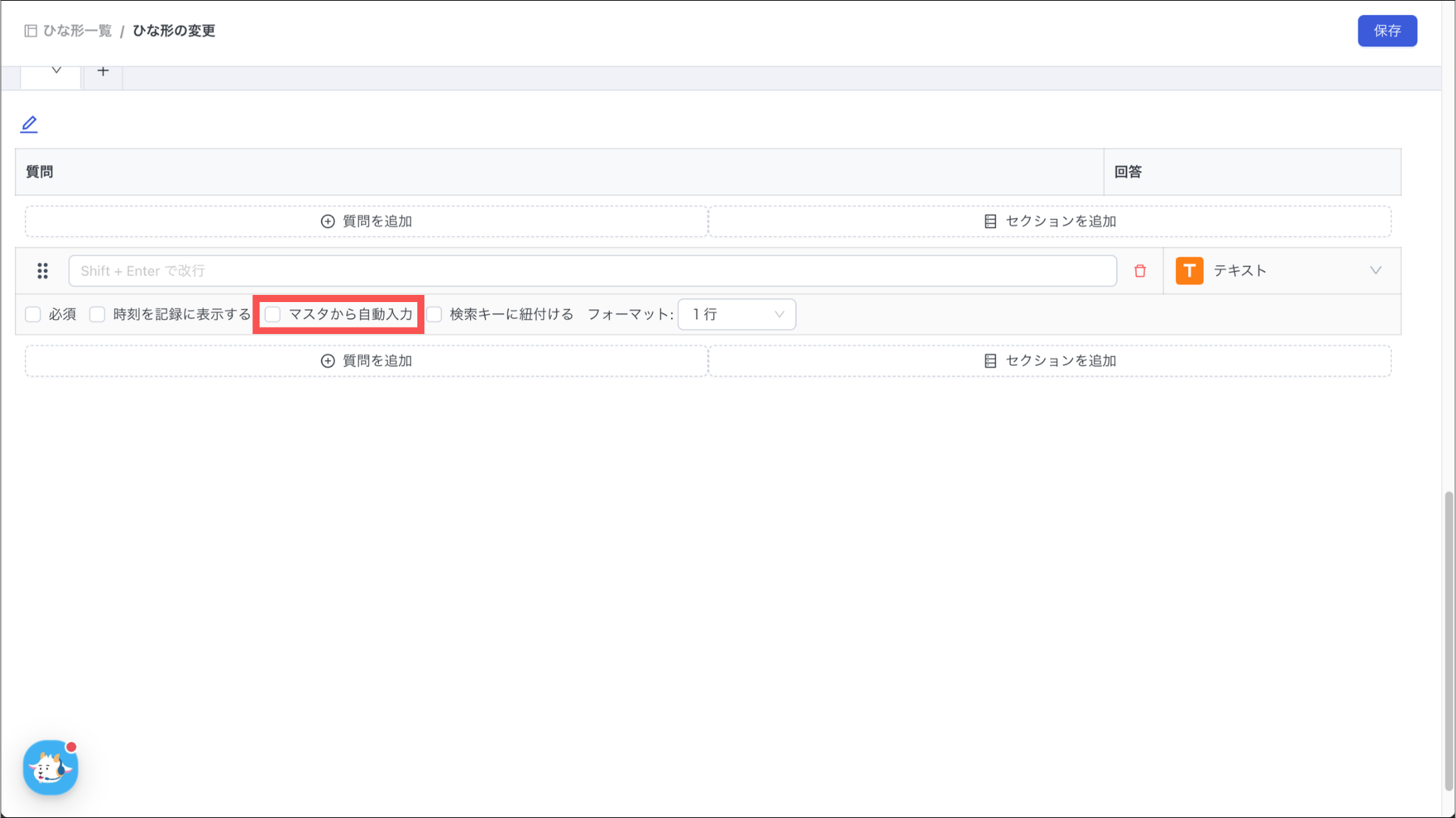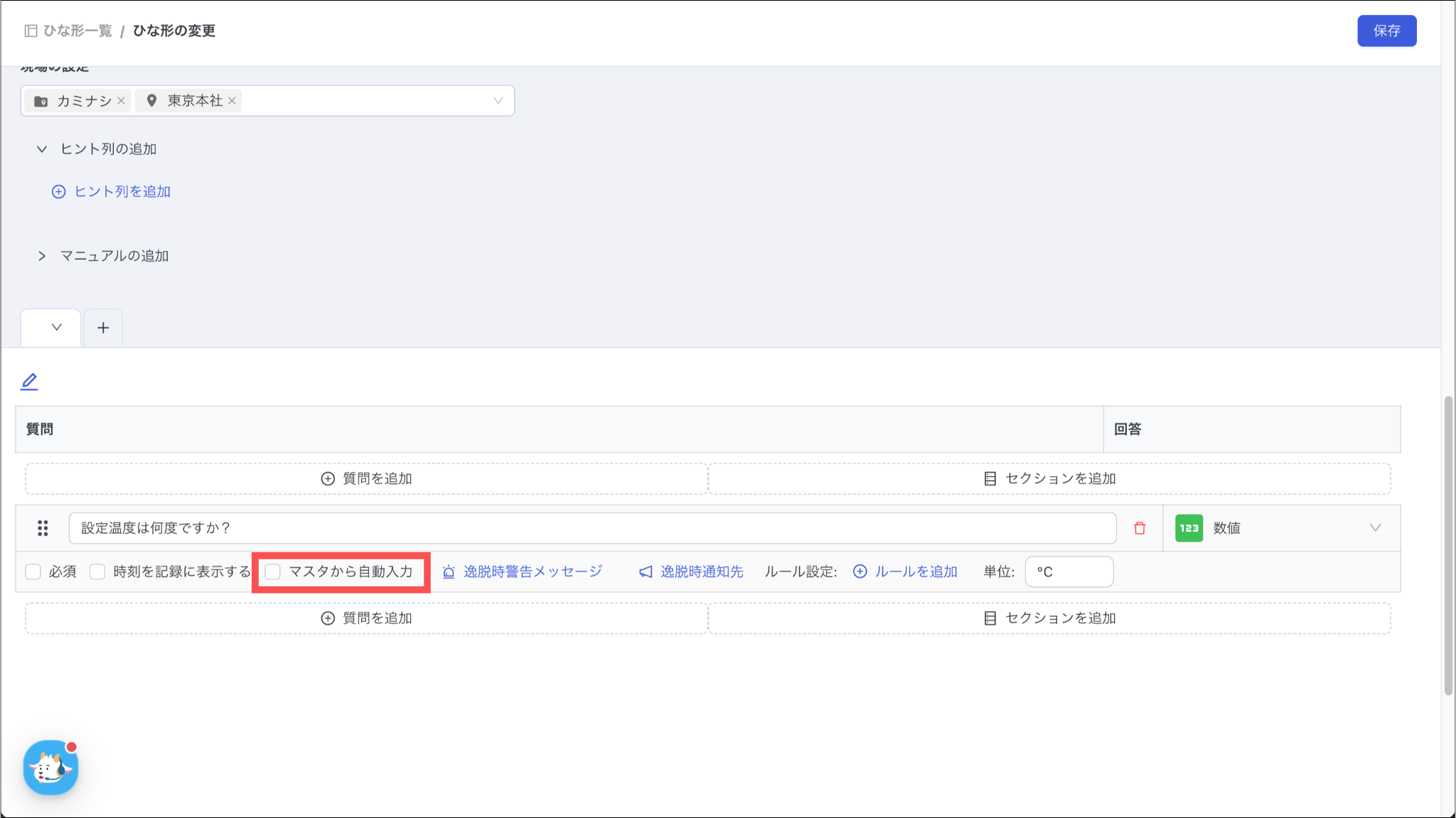 「□マスタからの自動入力」にチェックをいれると、あらかじめ登録しておいた製品マスタの項目のうち、同じ回答形式の項目を、自動で入力される項目として選択できます。