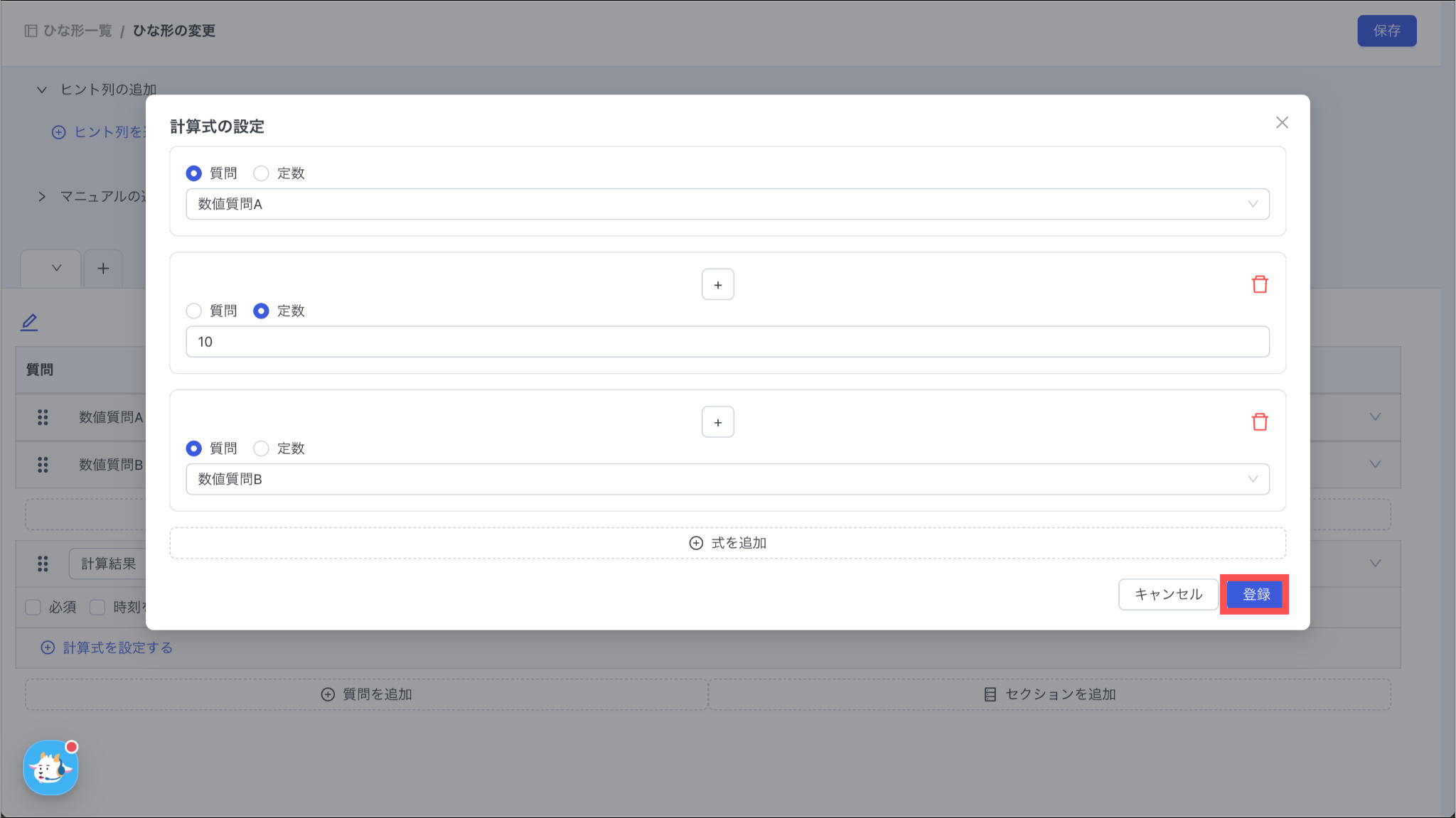 回答形式が「数値」で設定されている複数の質問や、あらかじめ決めた数字(定数)を組み合わせて、たし算・ひき算・かけ算・わり算を行うことができます。