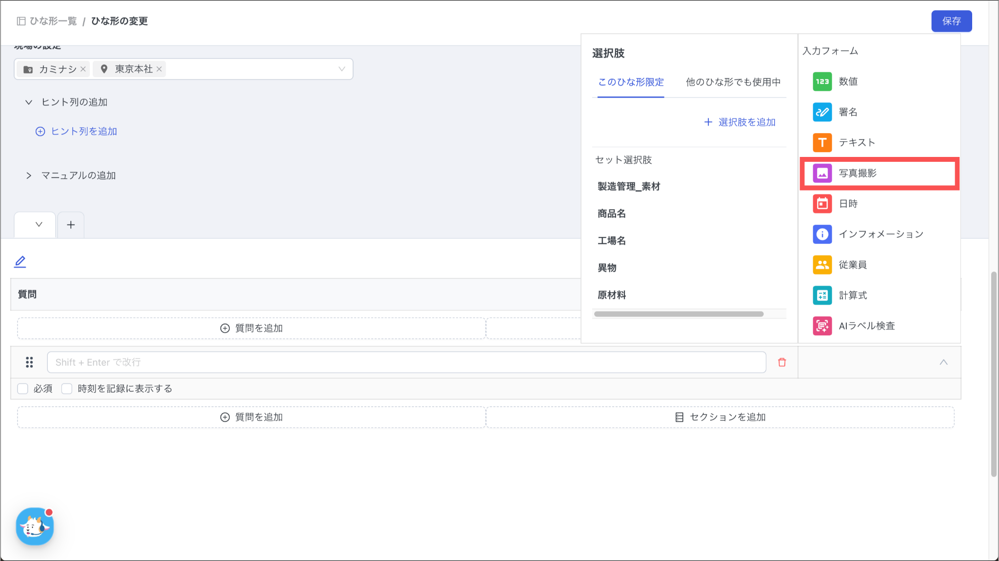 この回答形式を選んでおくと、レポートを記録するときに、スマホやタブレットのカメラが起動し、写真を記録できます。