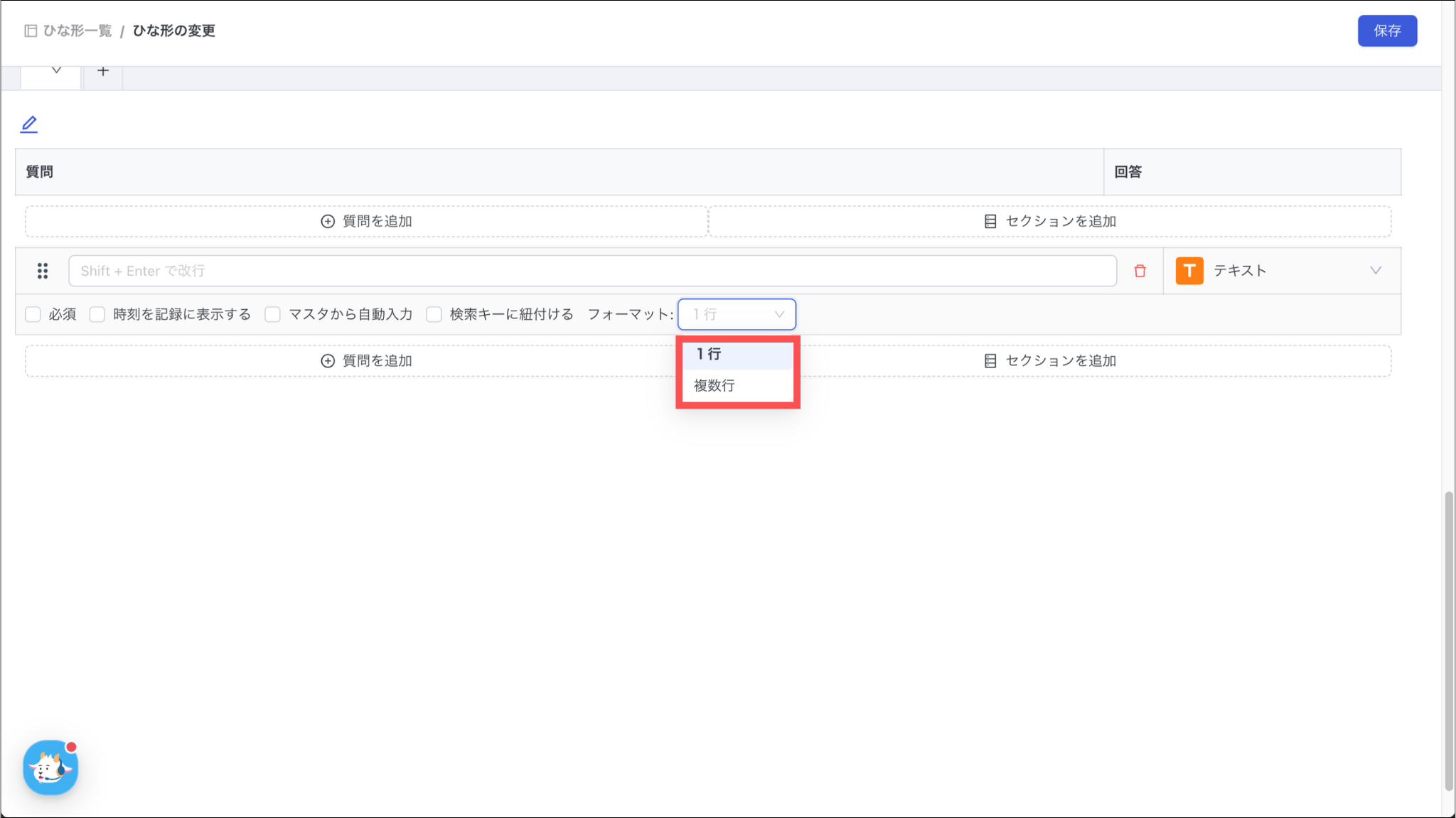 フォーマットは「1行」、「複数行」のいずれかを選択します。