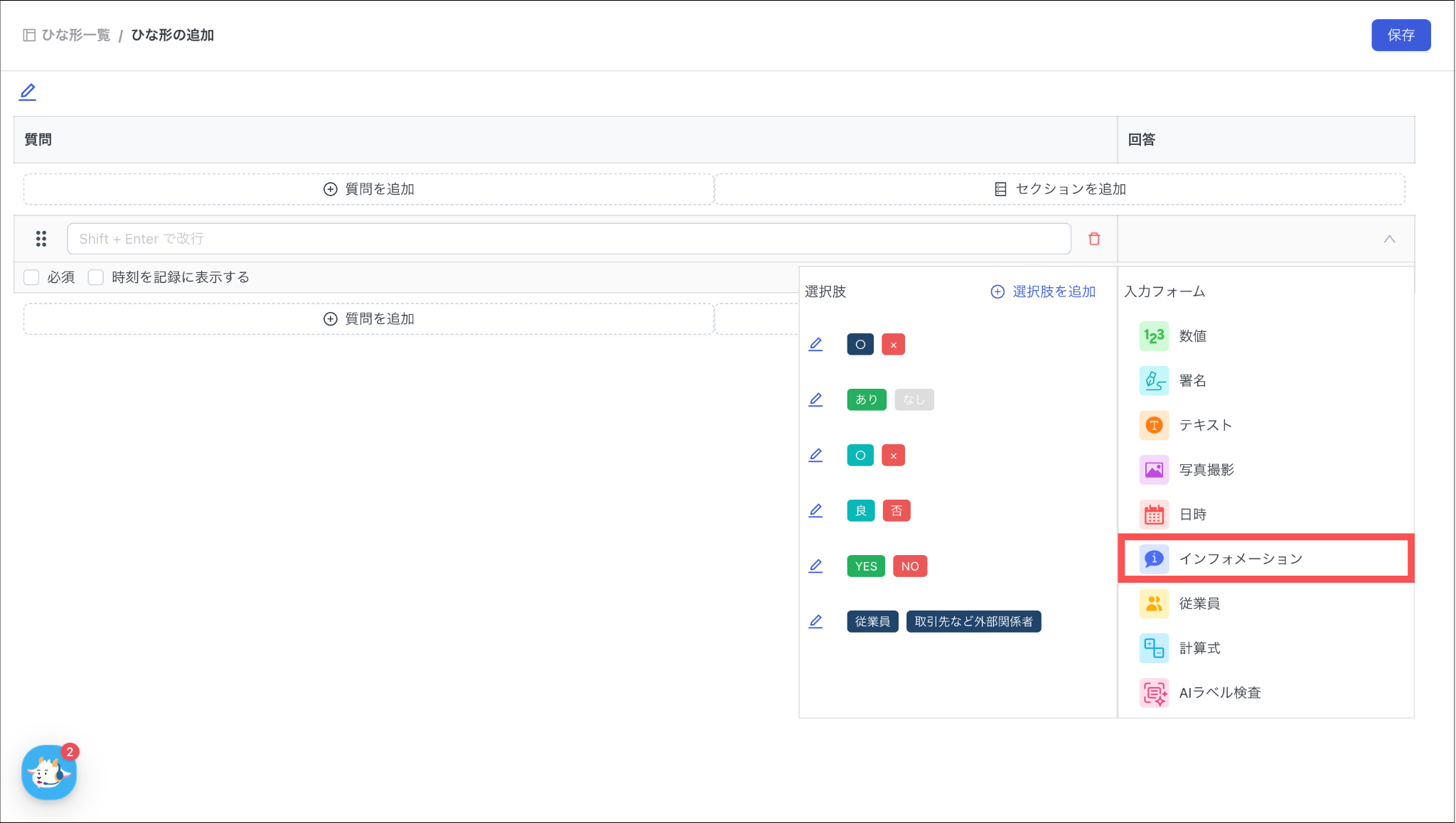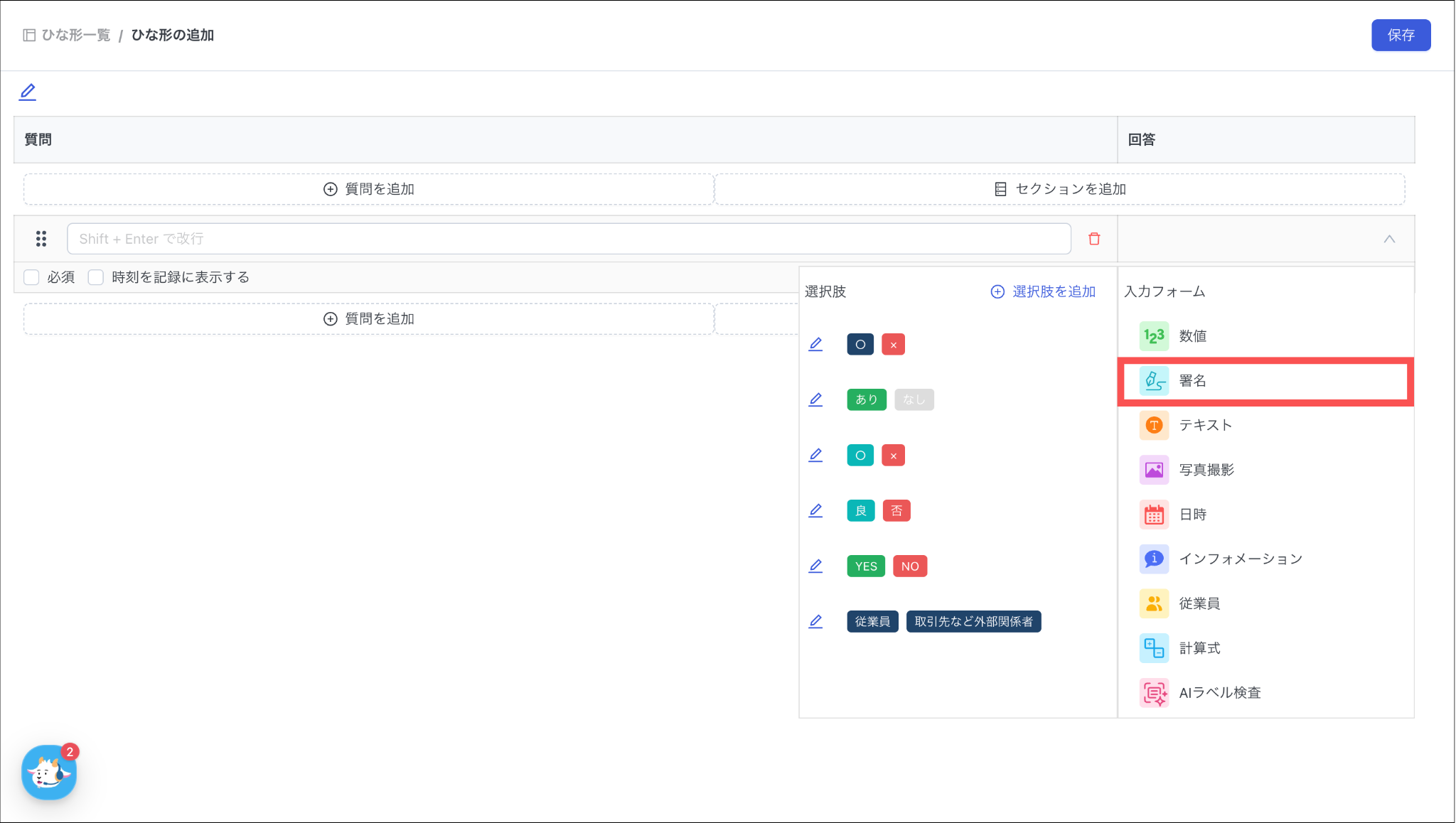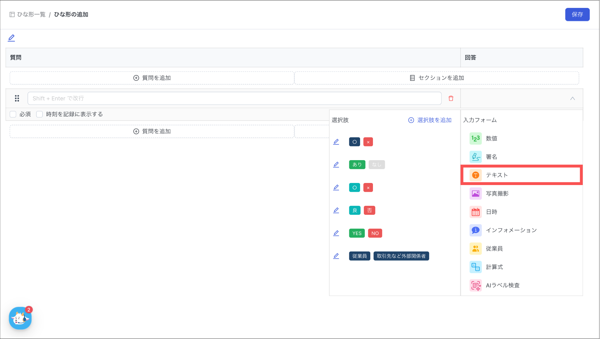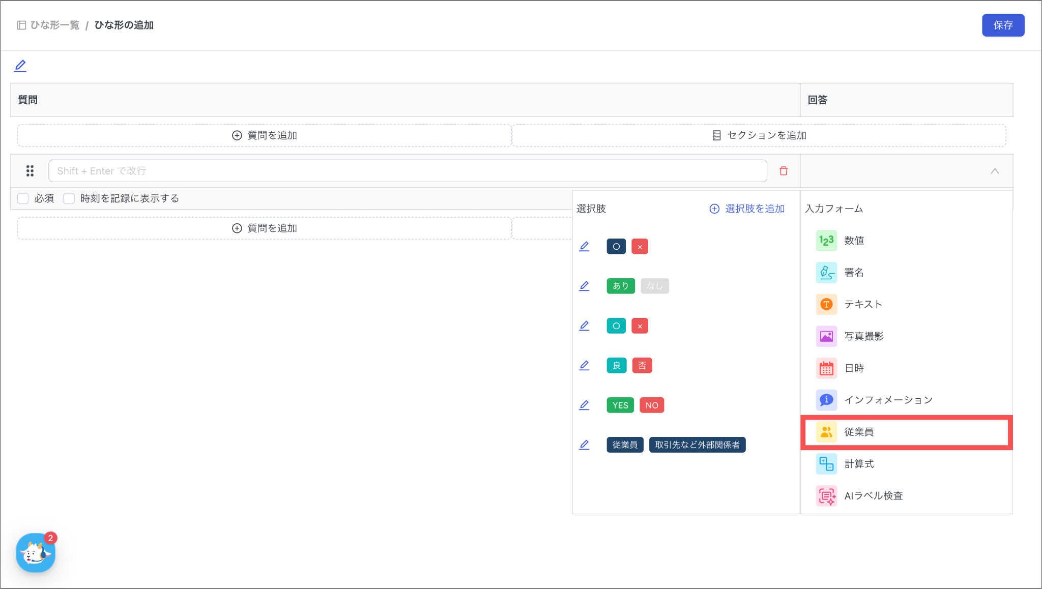 「複数名の選択を可能にする」にチェックをいれると、記録アプリでの入力時に「従業員」を複数名選択することができます