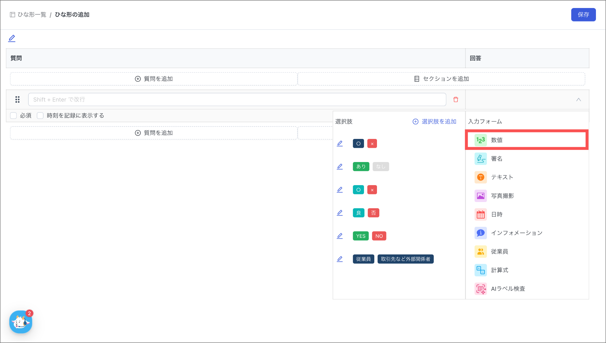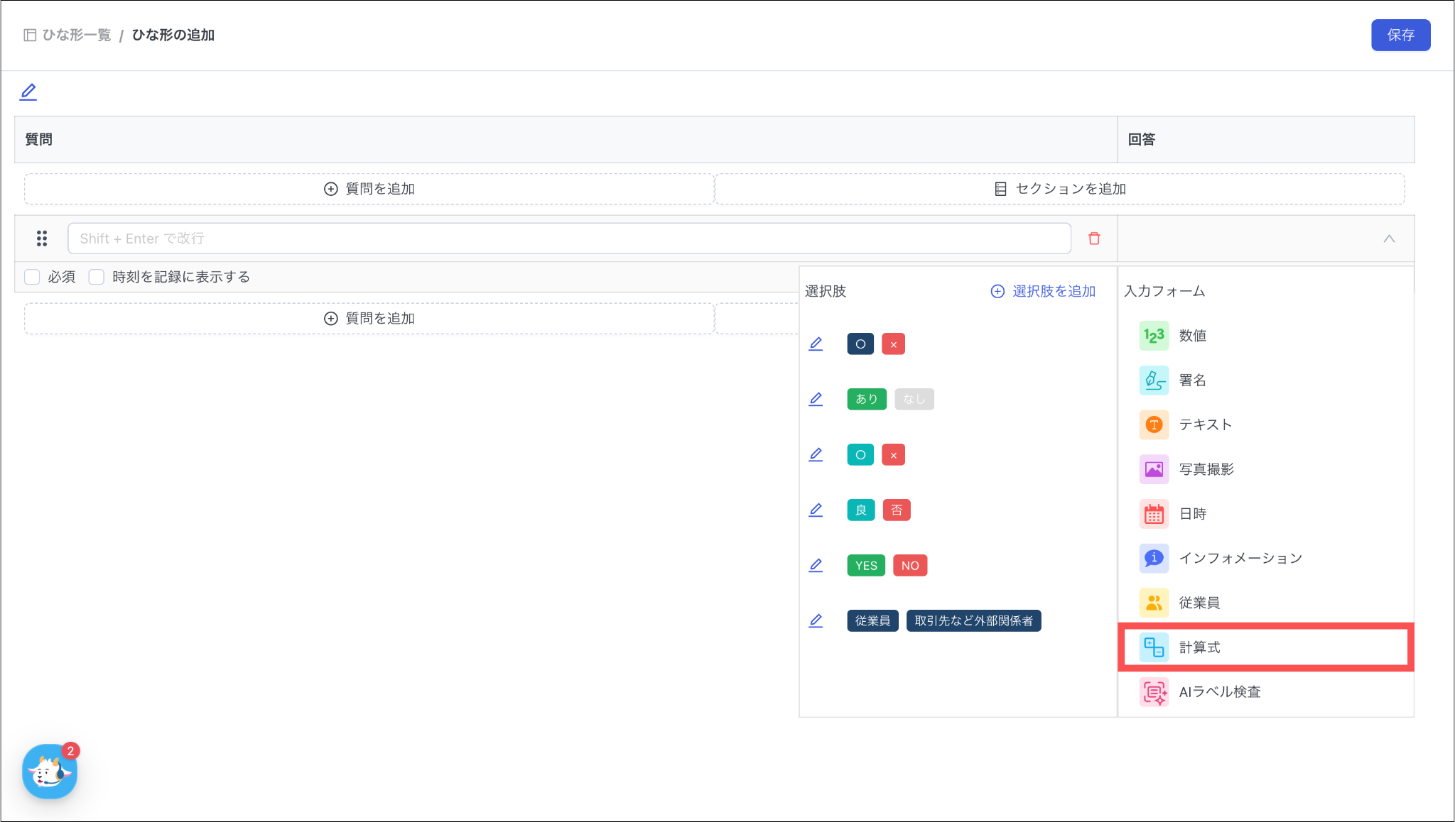 計算式に設定すると、同じひな形内で、回答形式が数値になっている質問の回答を計算し、自動的に算出することができます。