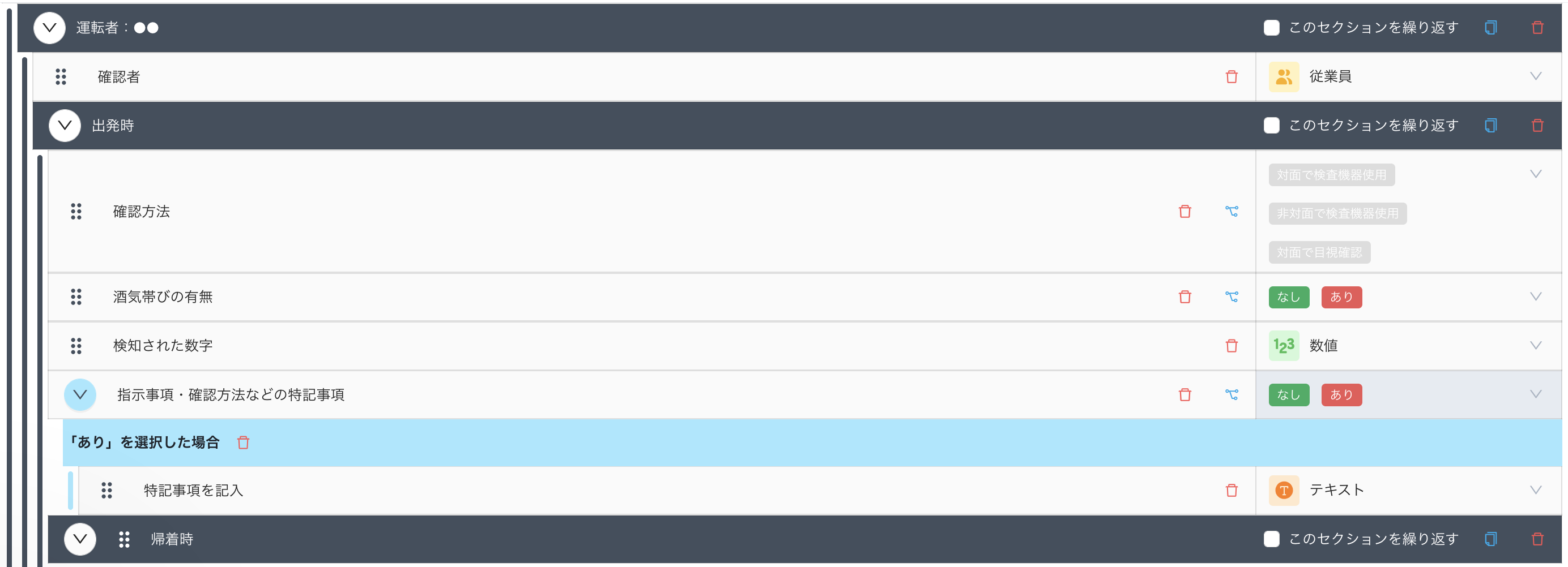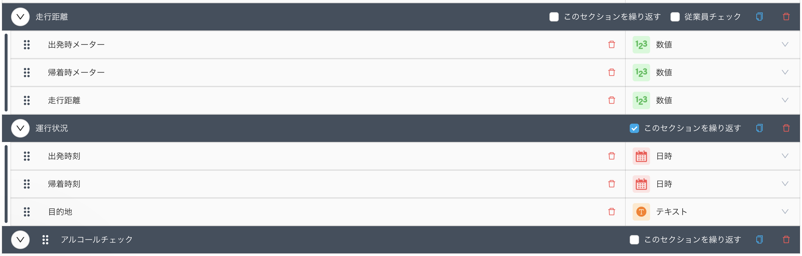 運行状況は、複数の場所にいくこともあるので、「セクション繰り返し」機能を活用し、任意の数を入力できるように設定しましょう。
