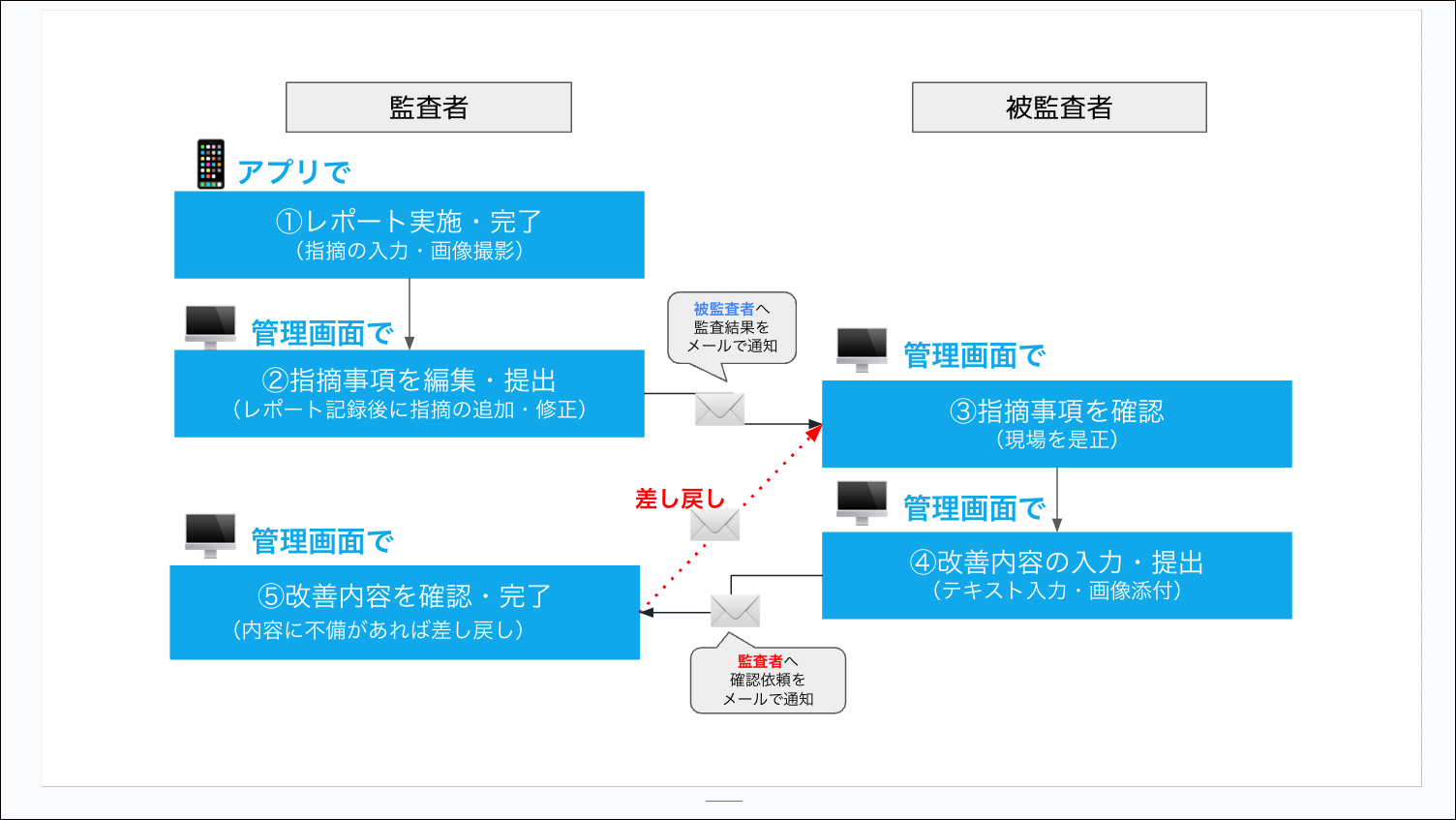 監査者となるユーザーは指摘を行い、被監査者となるユーザーは改善の実施と報告を行います。