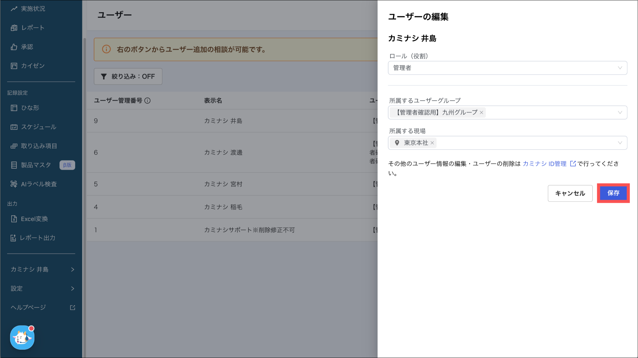 その他のユーザー情報(ユーザー管理番号・表示名・メールアドレス)の編集やユーザー削除はカミナシID管理で行う必要があります。