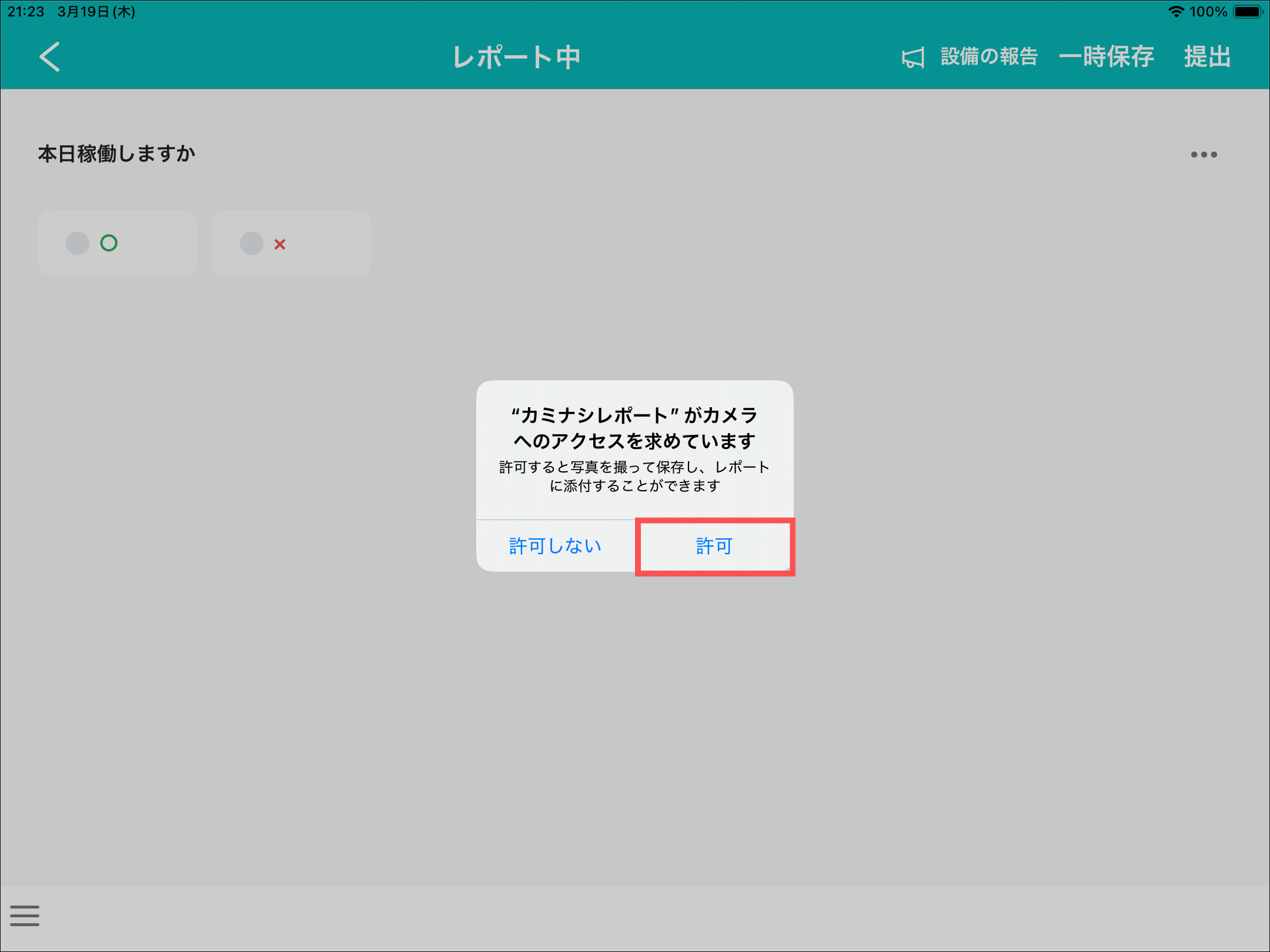 アプリ内で写真を撮影するために、カメラへのアクセス許可が必要となります。