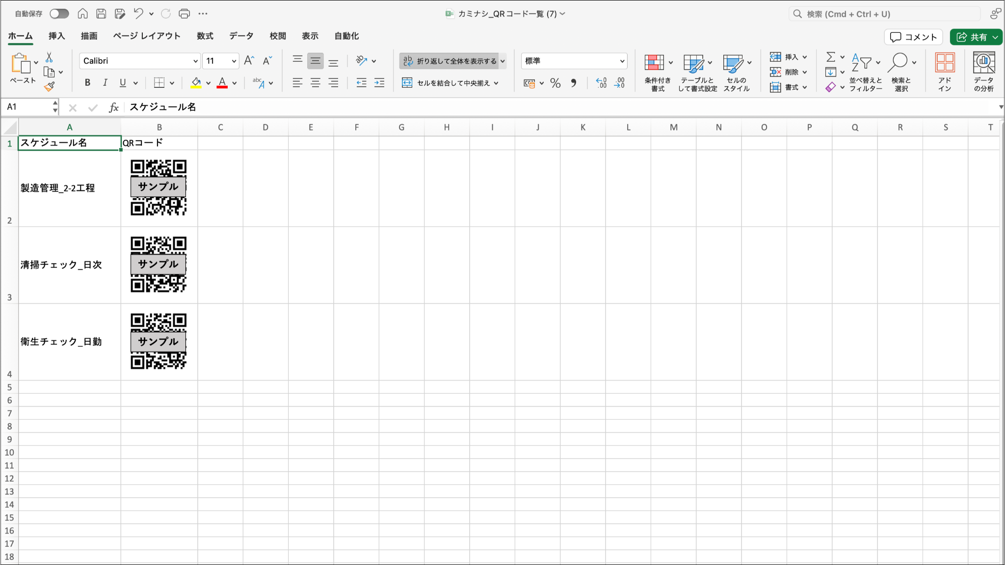 Excelファイルにスケジュール名と、QRコードの画像が出力されます。