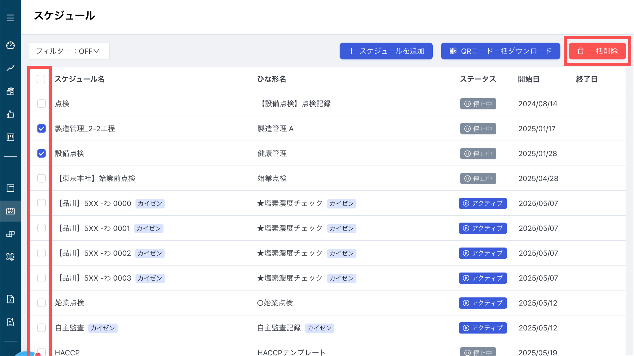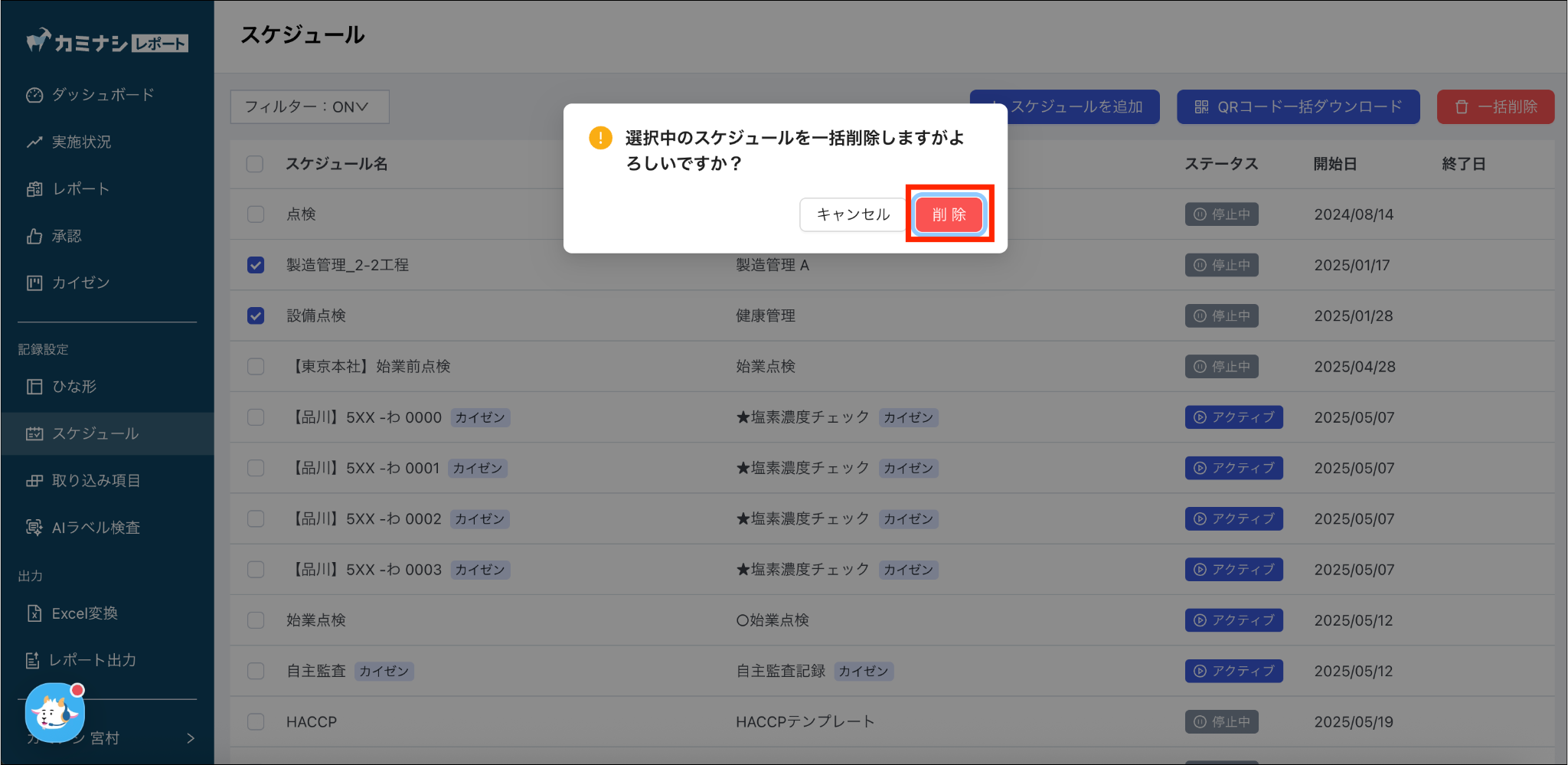 1.カミナシレポート 管理画面にログインする2.「スケジュール」を押す3. 削除するスケジュールにチェックを入れ、「一括削除」を押す4.「削除」を押す一度削除されたスケジュールは復元できませんのでご注意ください。よくある質問は、こちらからご確認ください。