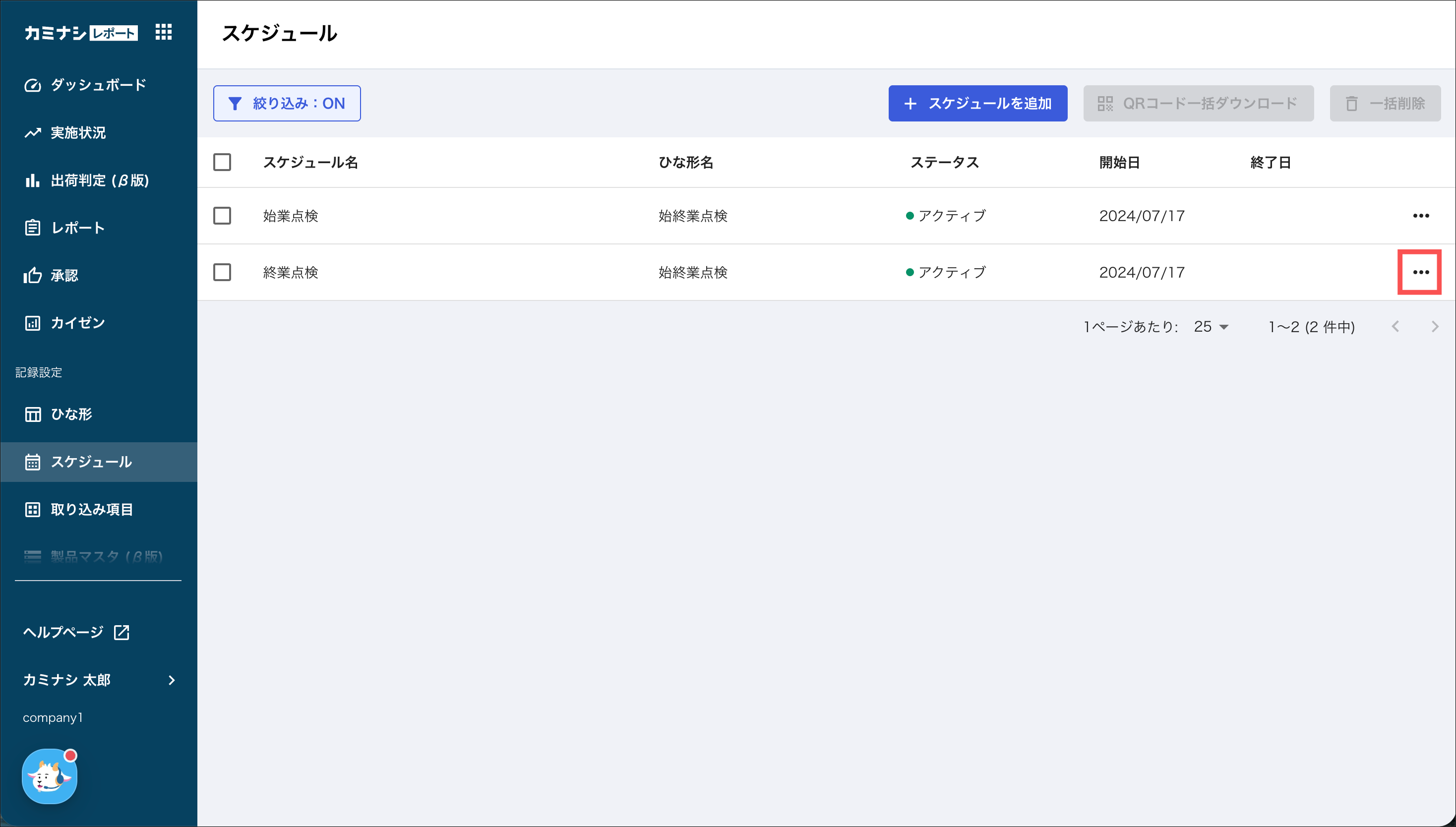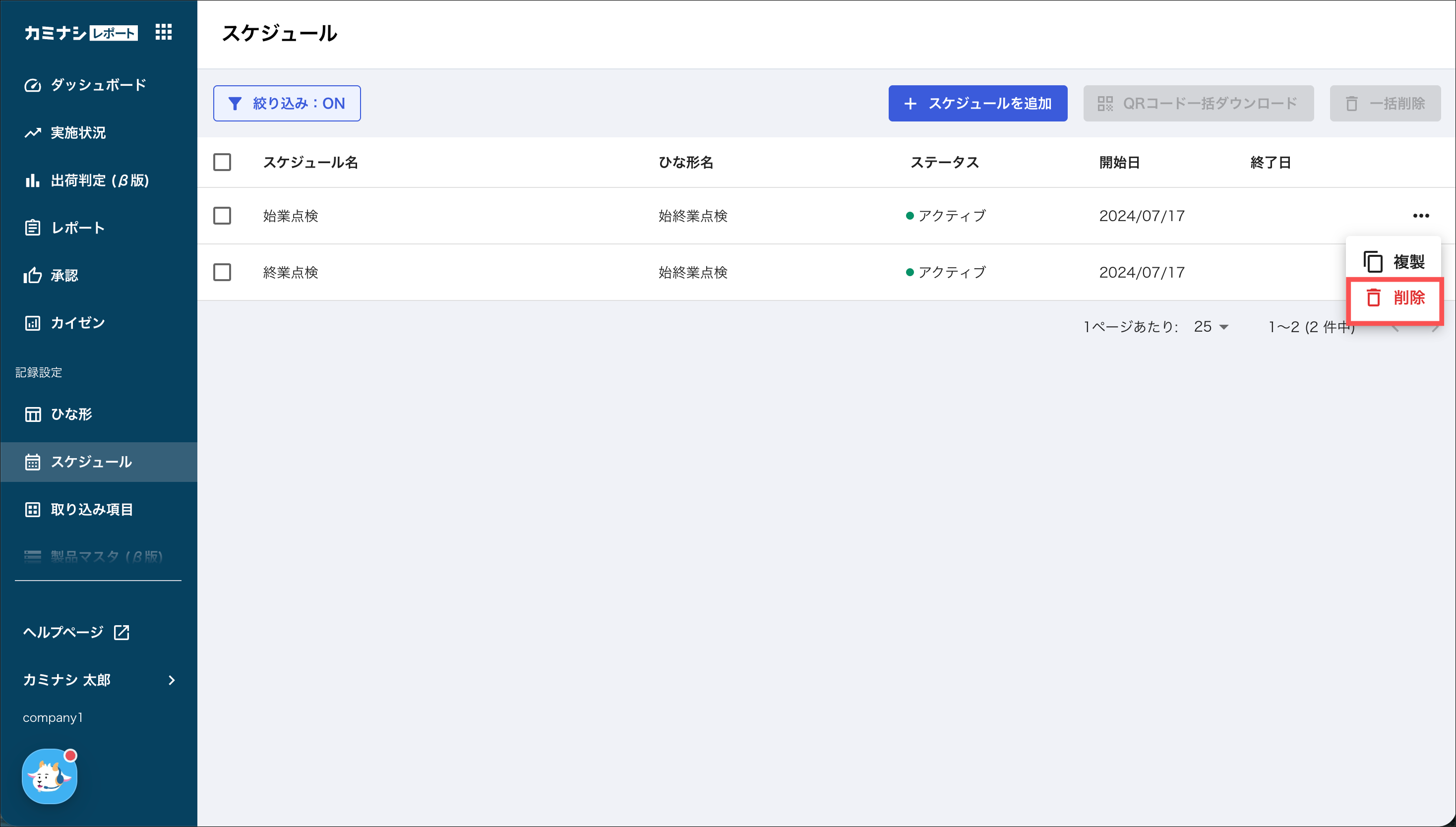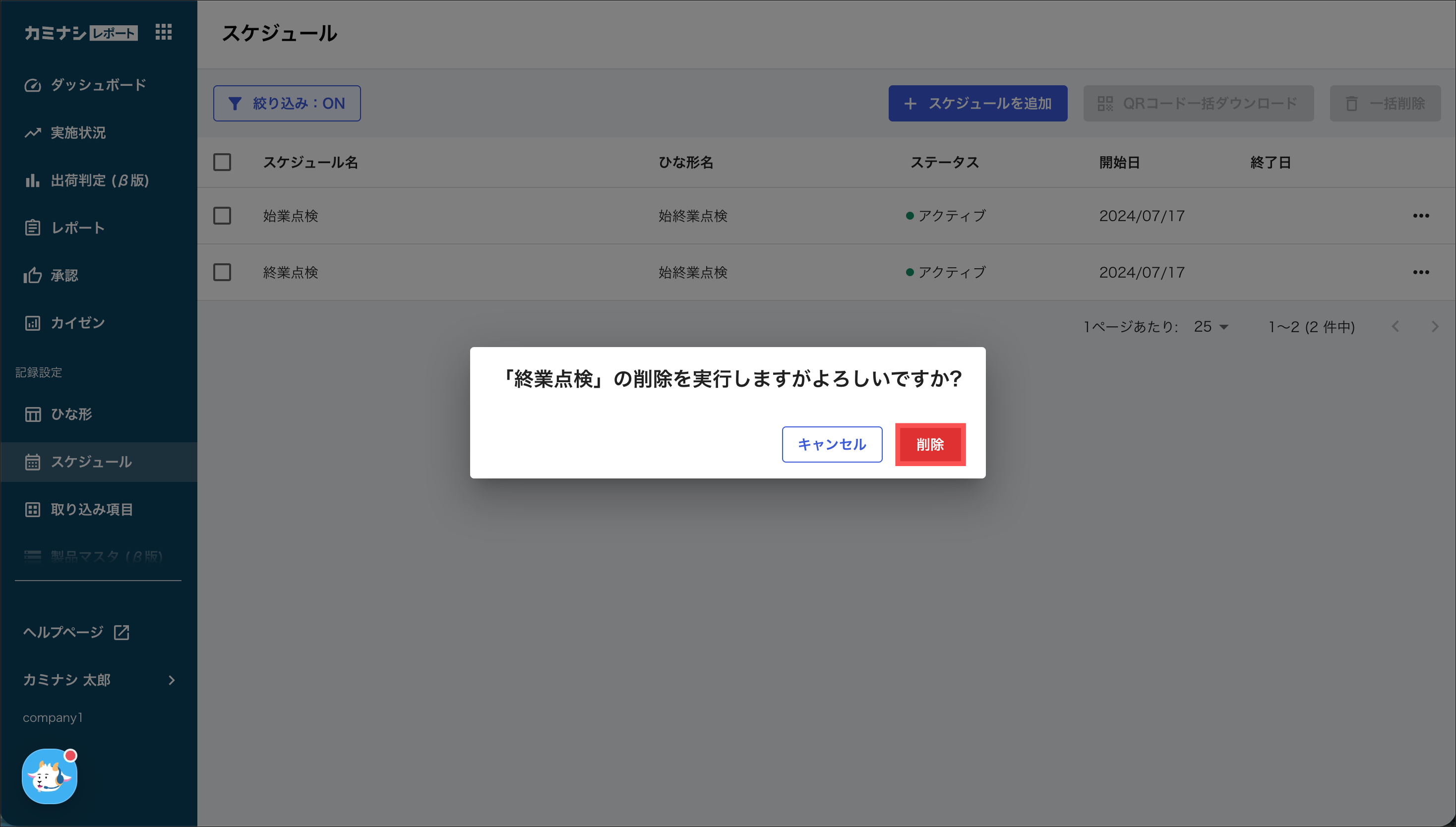 1.カミナシレポート 管理画面にログインする2.「スケジュール」を開き、削除するスケジュールの「⋯」を押す3.「削除」を押す4.「削除」を押す一度削除されたスケジュールは復元できませんのでご注意ください。よくある質問は、こちらからご確認ください。