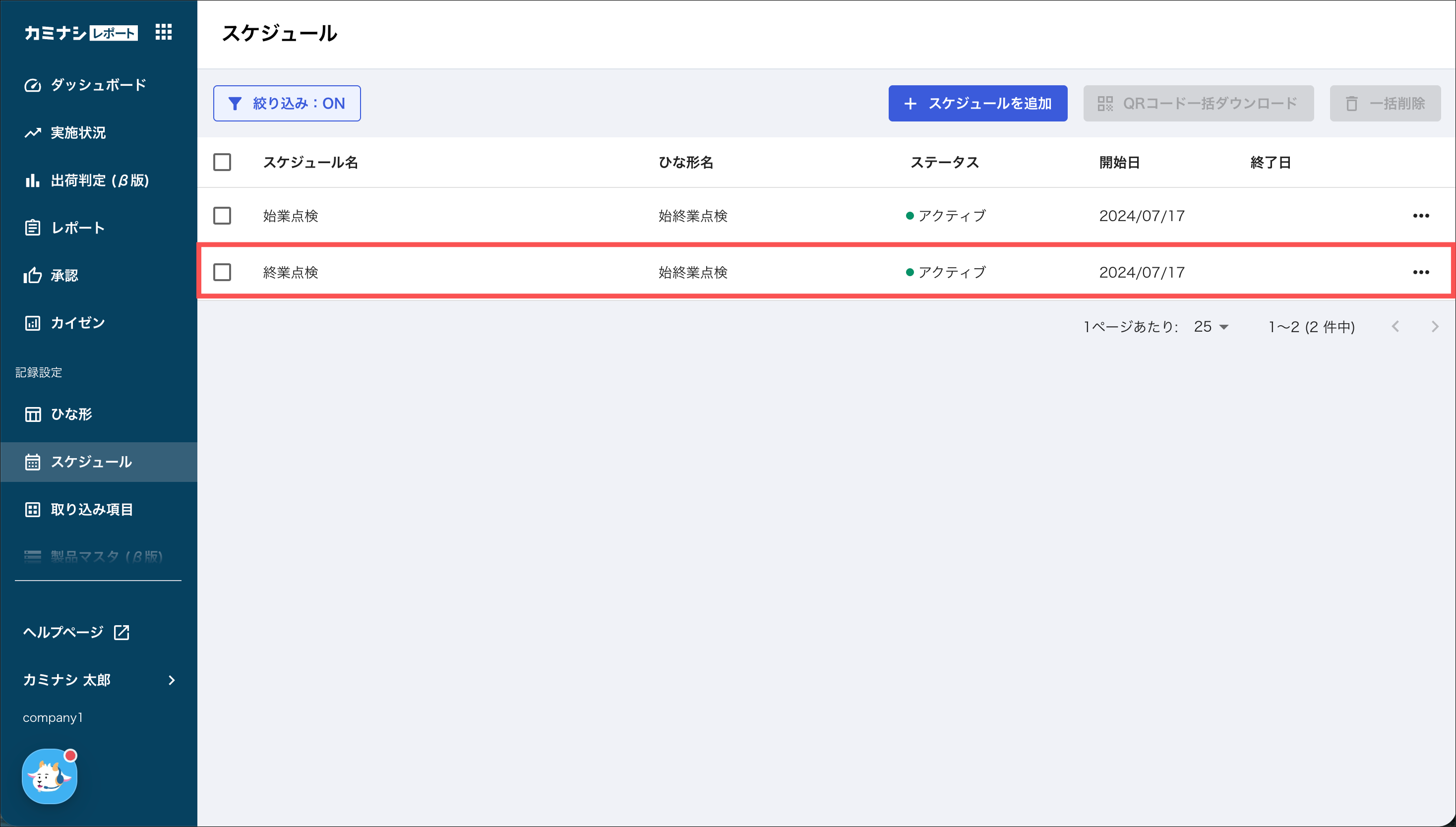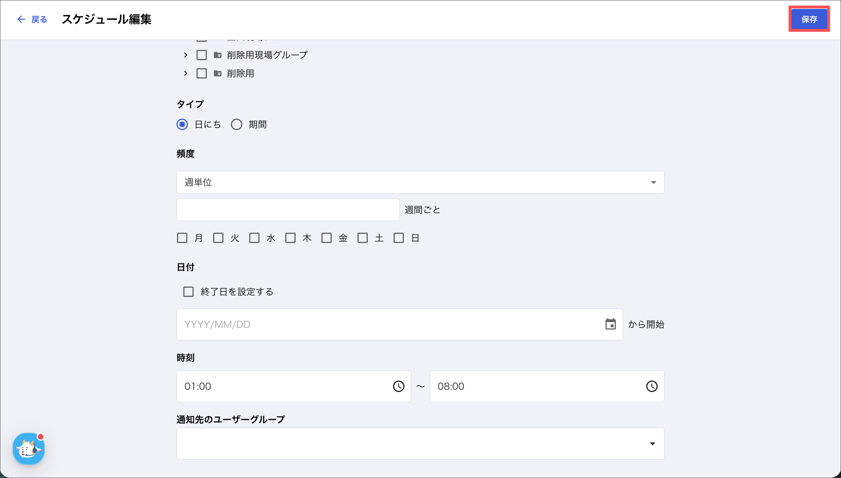 1.カミナシレポート 管理画面にログインする2.「スケジュール」を開き、編集するスケジュールを押す3.スケジュール内容を変更し、「保存」を押す各項目については、「スケジュールを作成する」をご参照ください。よくある質問は、こちらからご確認ください。