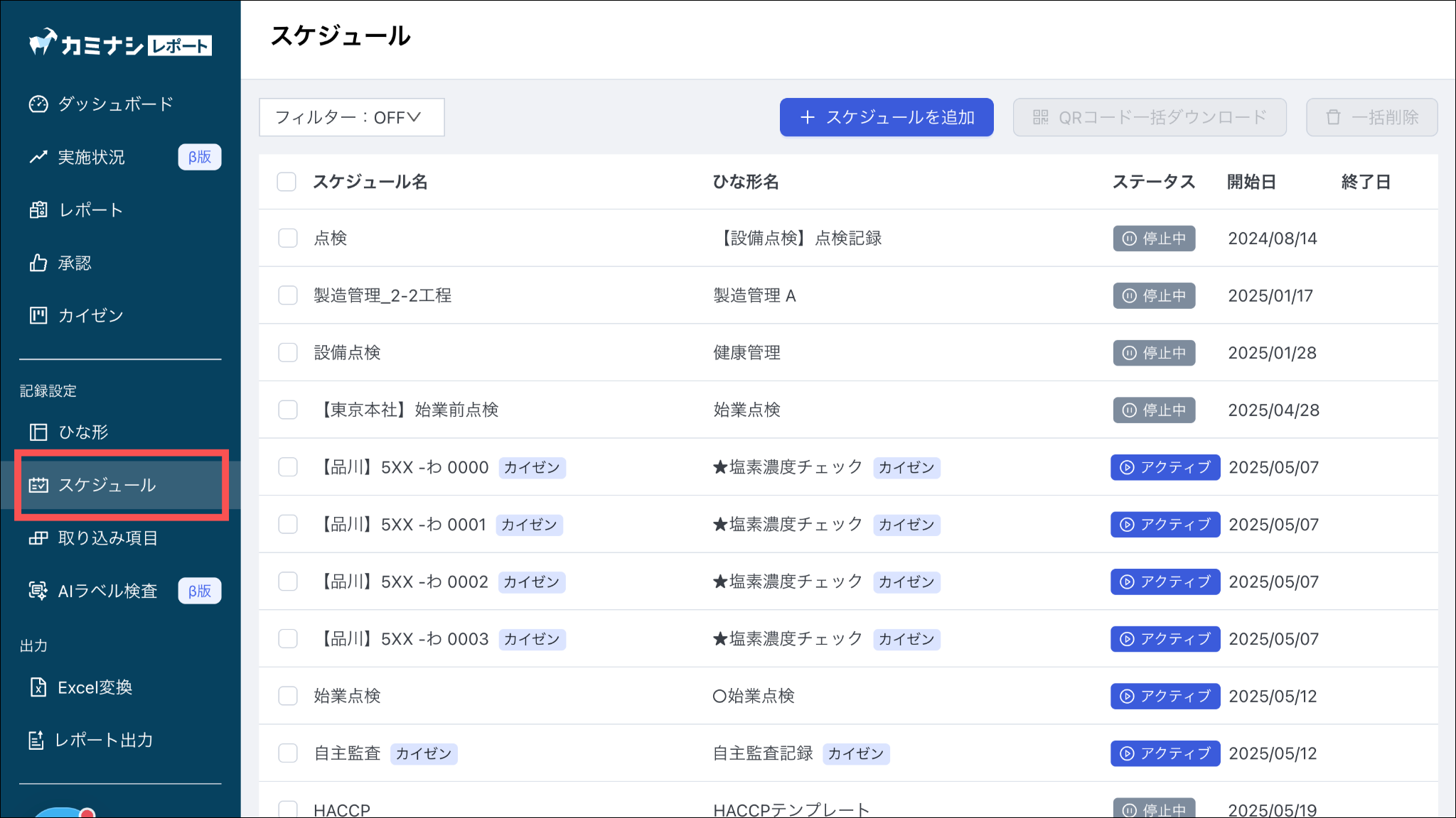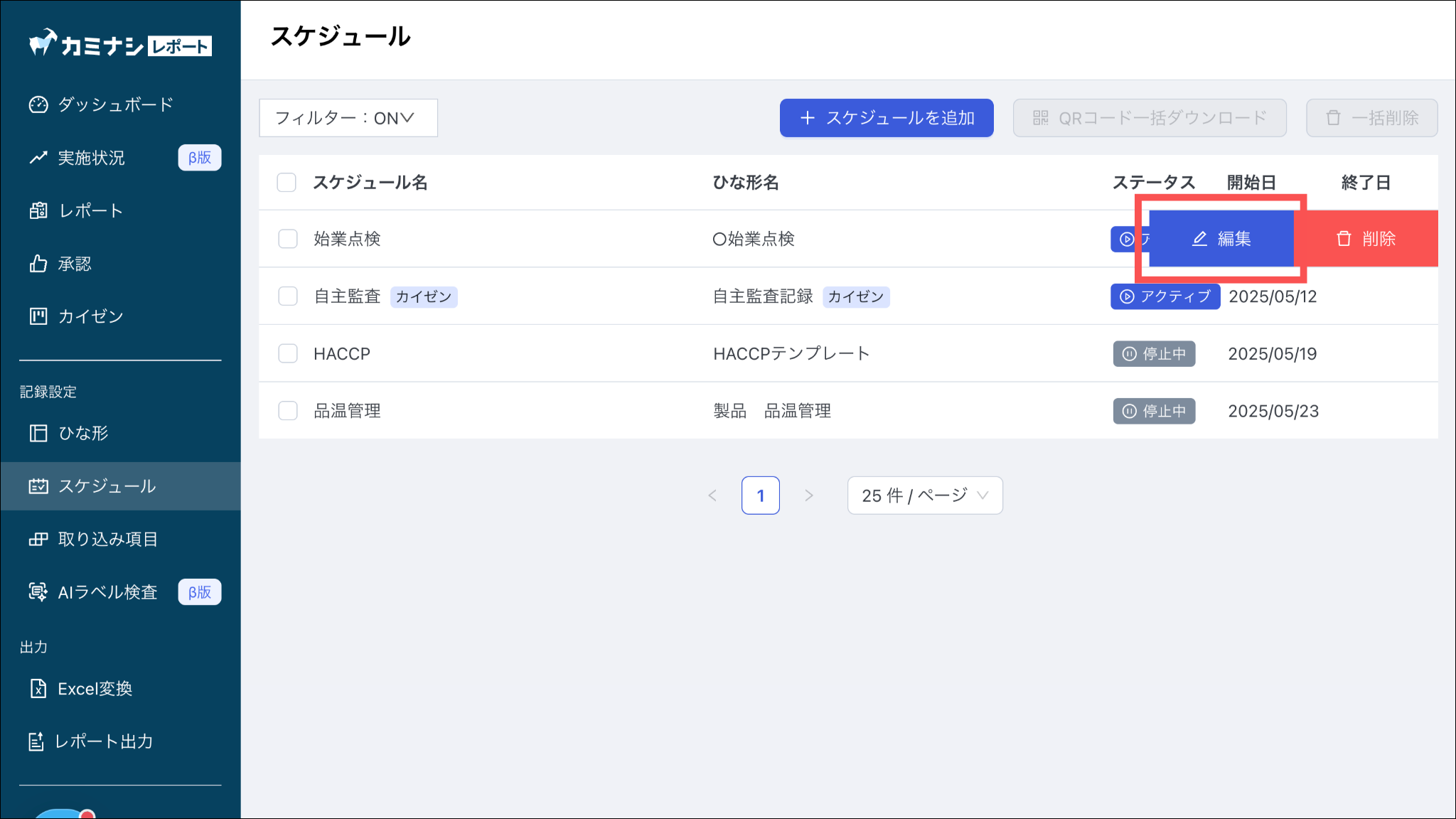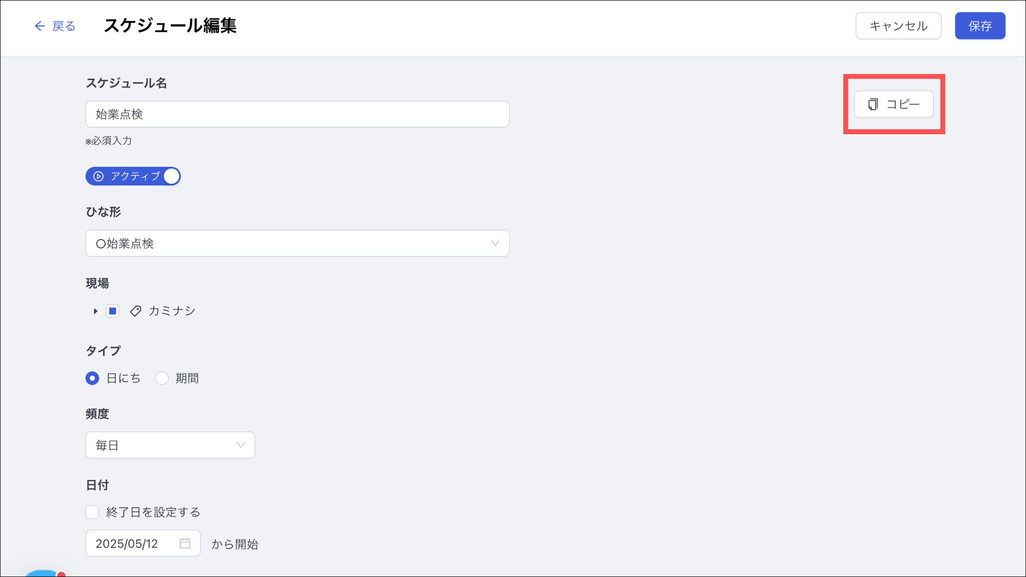 1.カミナシレポート 管理画面にログインする2.「スケジュール」を押す3. コピーするスケジュールの「編集」を押す4.「コピー」を押す5. 変更が必要な項目を編集し、「保存」を押すよくある質問は、こちらからご確認ください。
