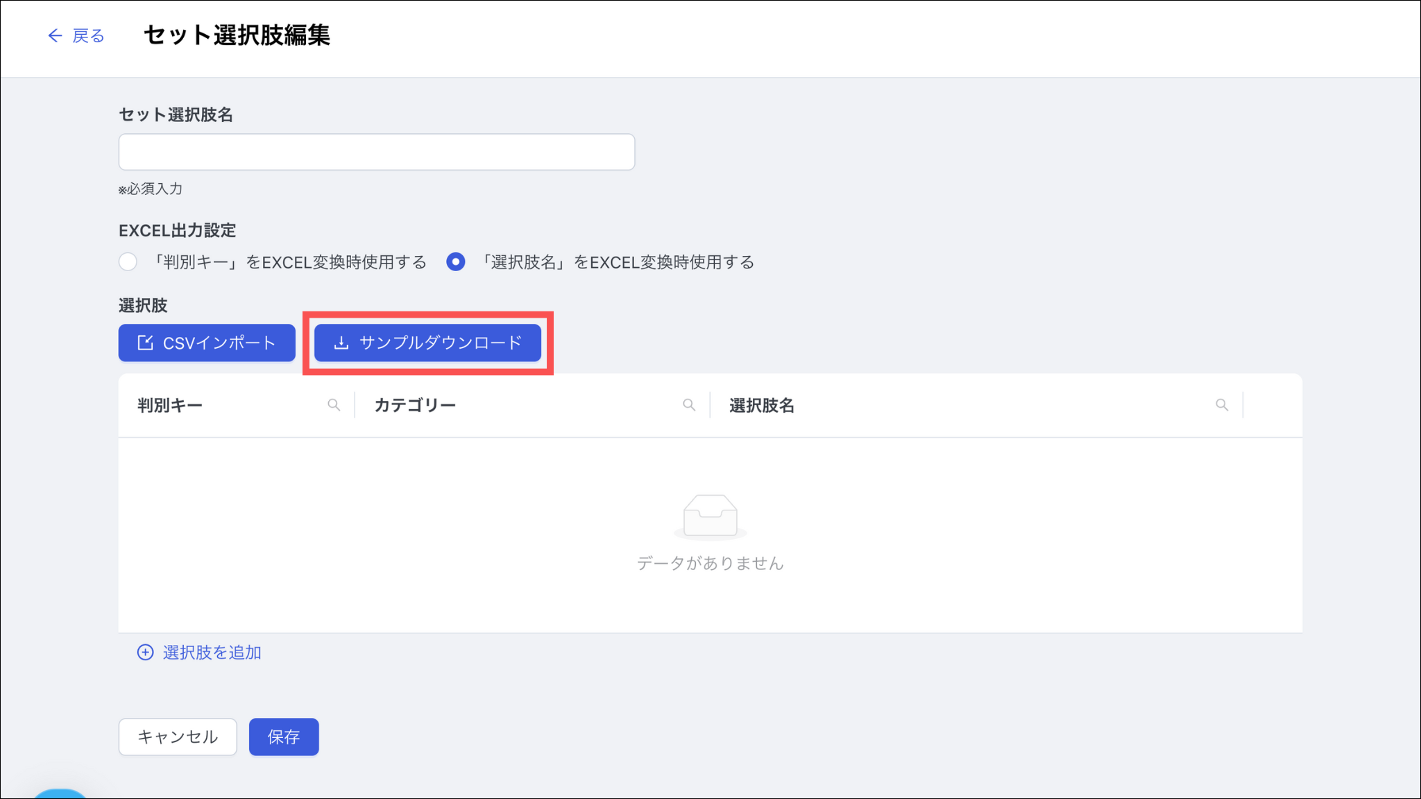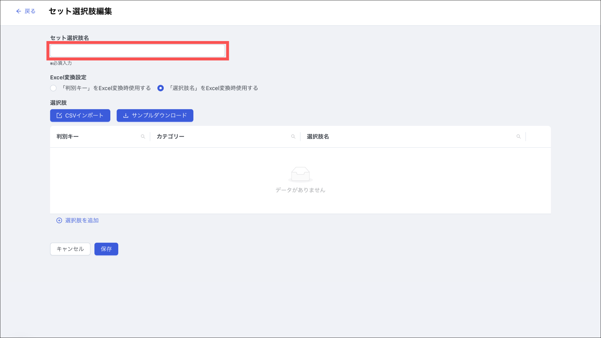 ひな形作成時にセット選択肢の表示名として表示される名称を設定します。