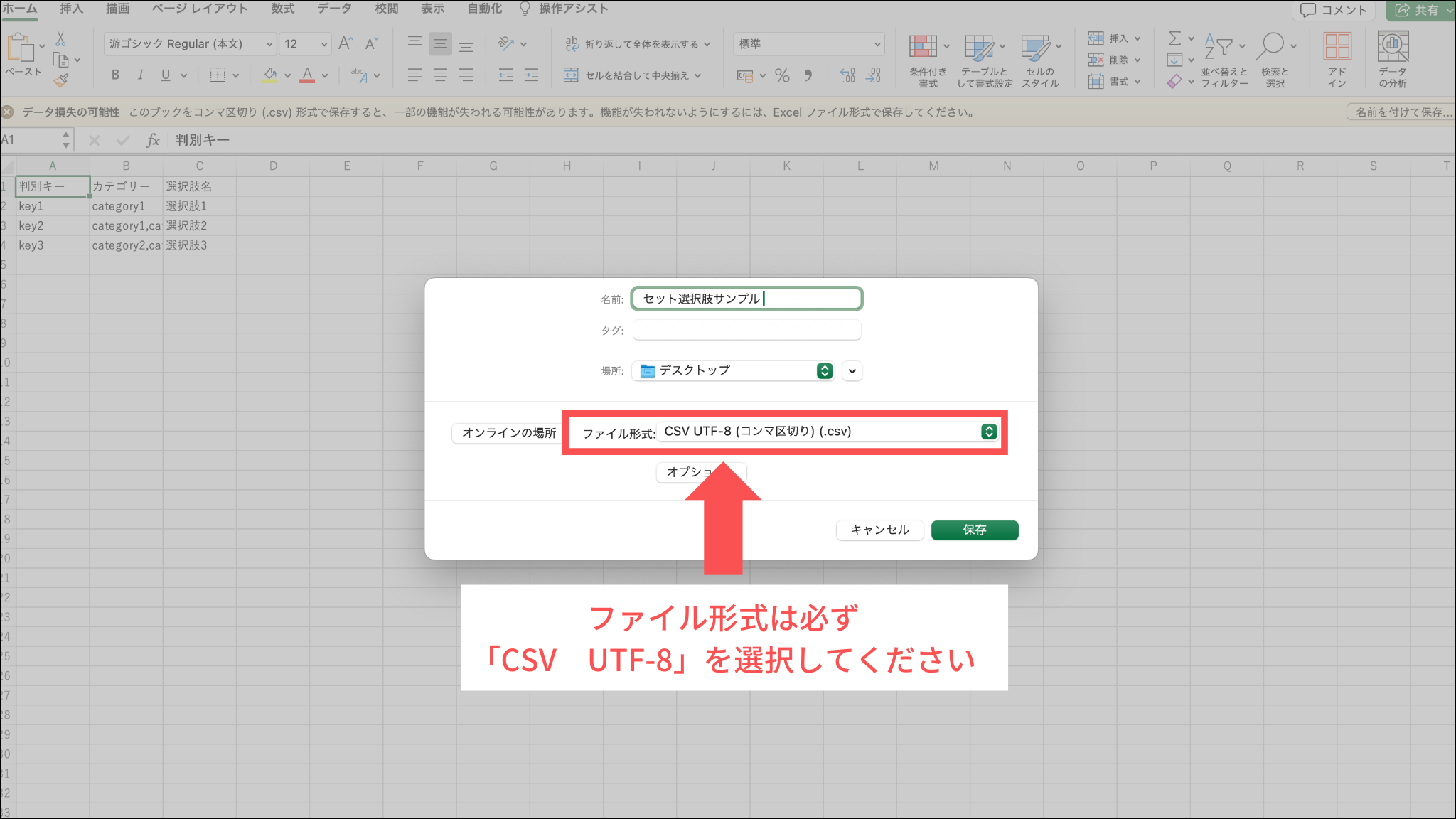 ファイル形式は、必ず「CSV UTF-8」を選択して保存してください。