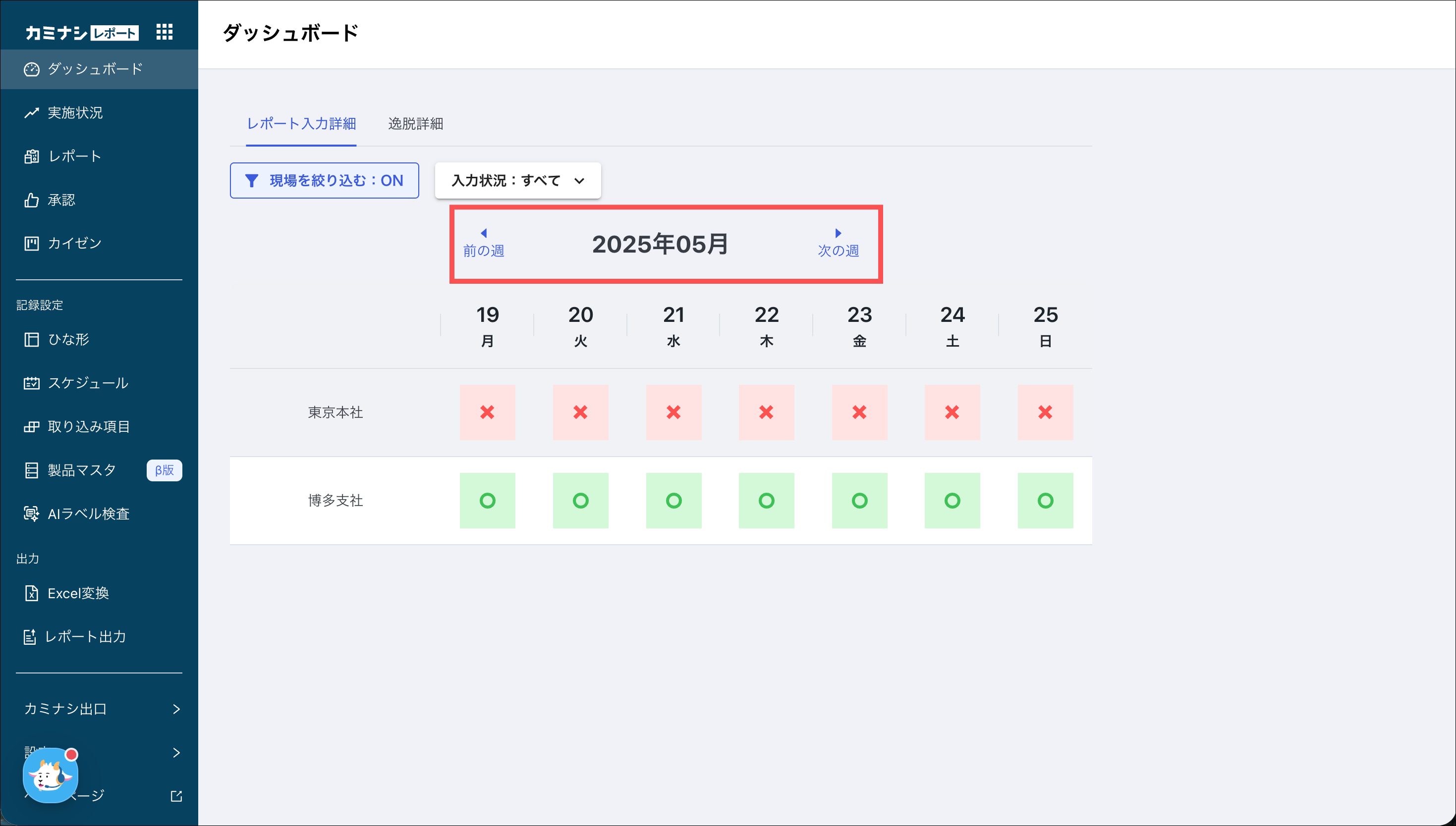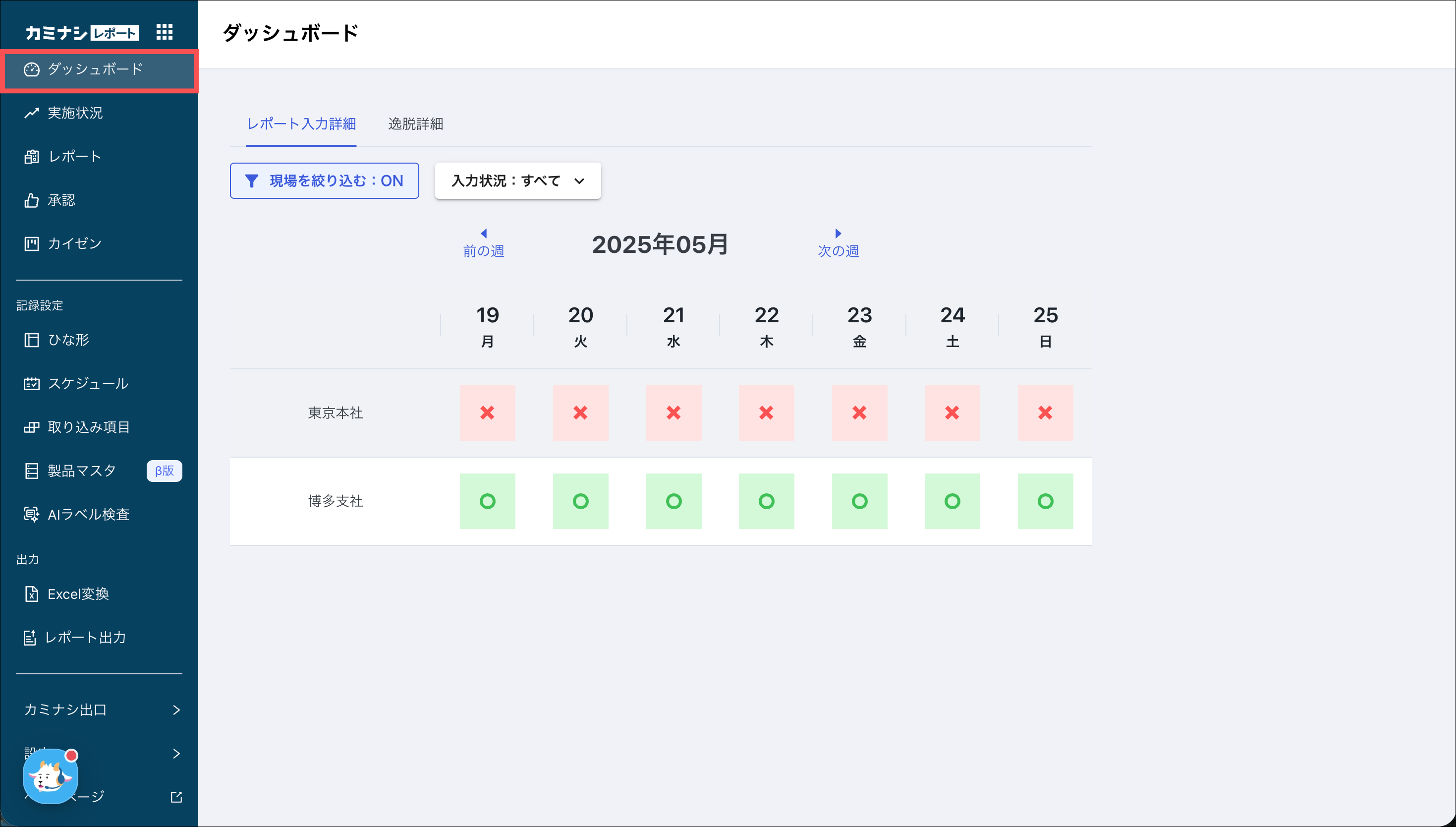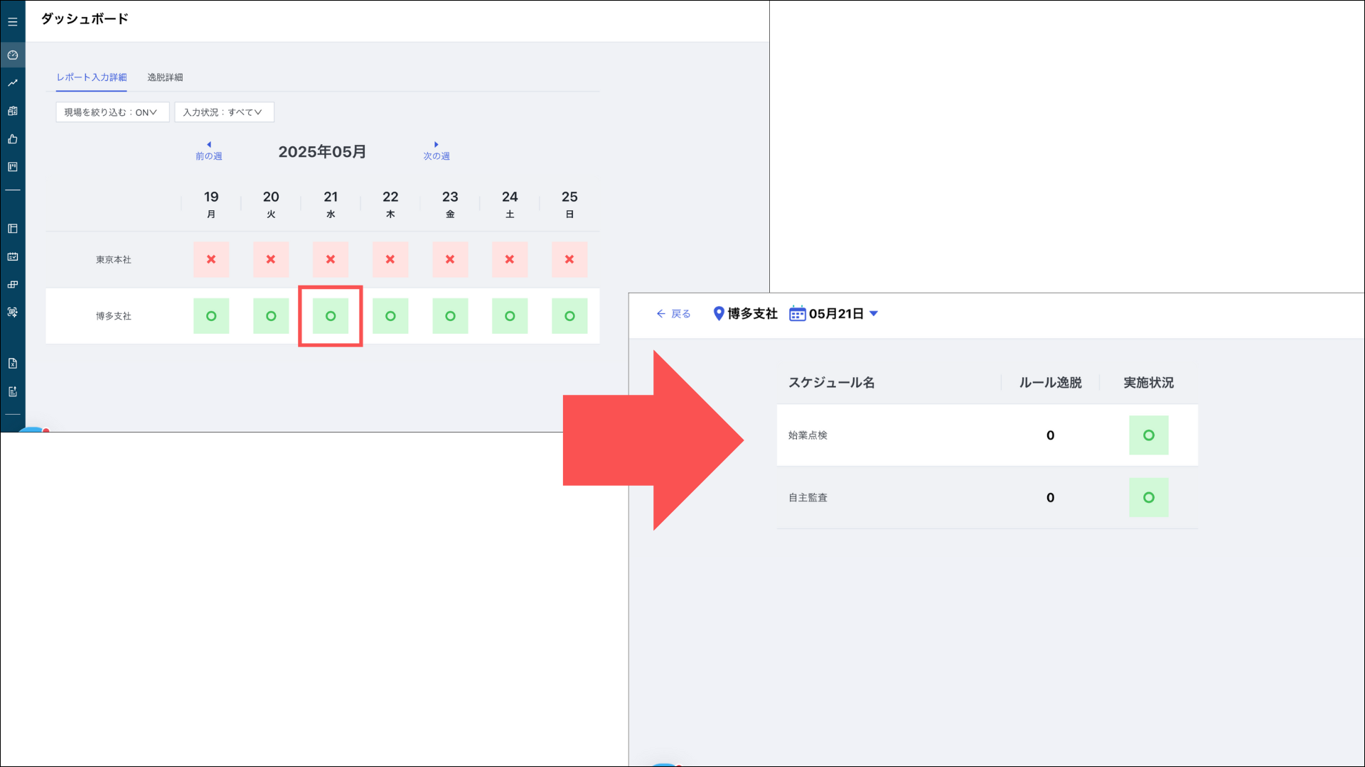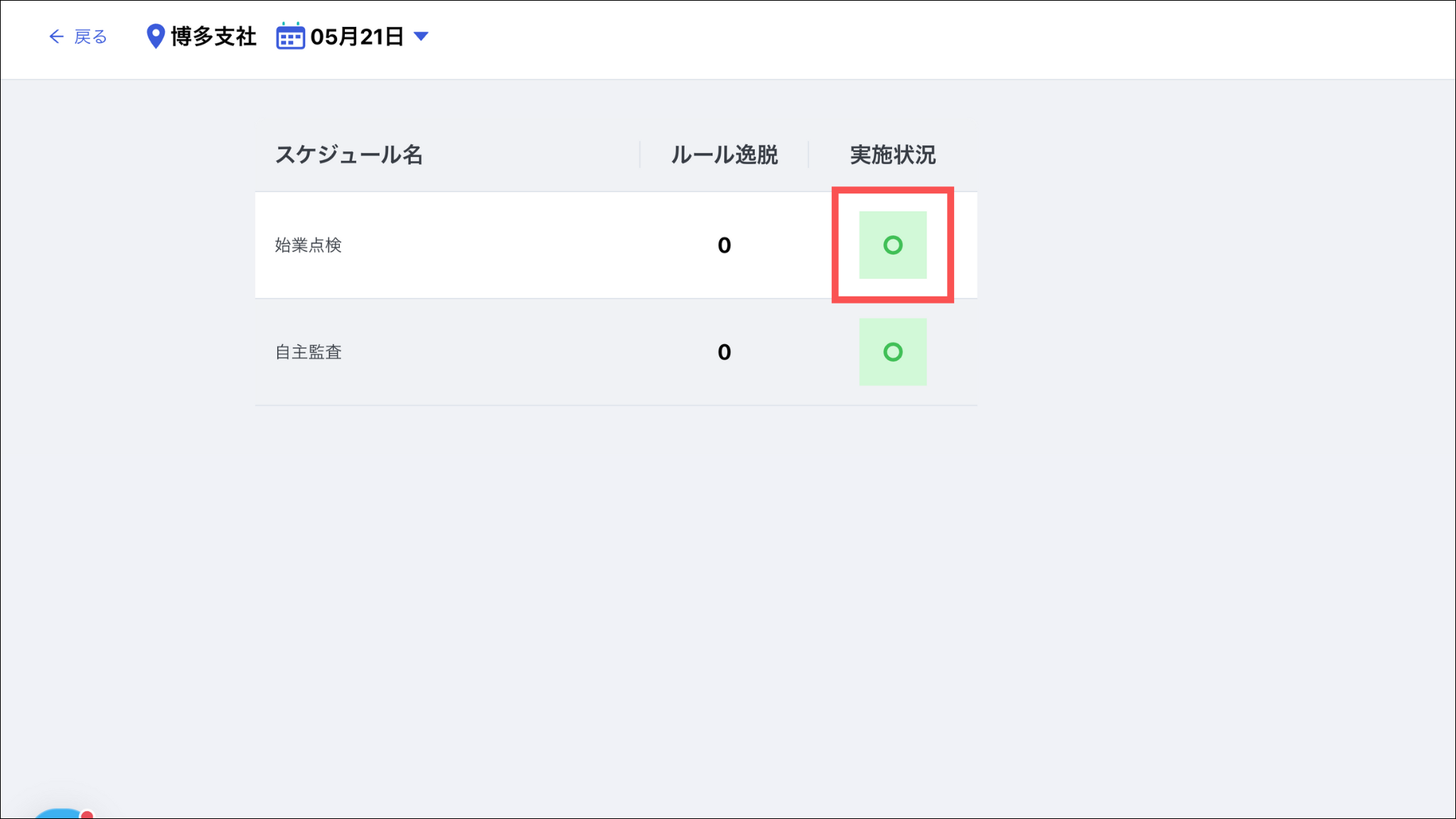 実施状況の「◯」を押すと、該当のレポート内容を確認することができます。