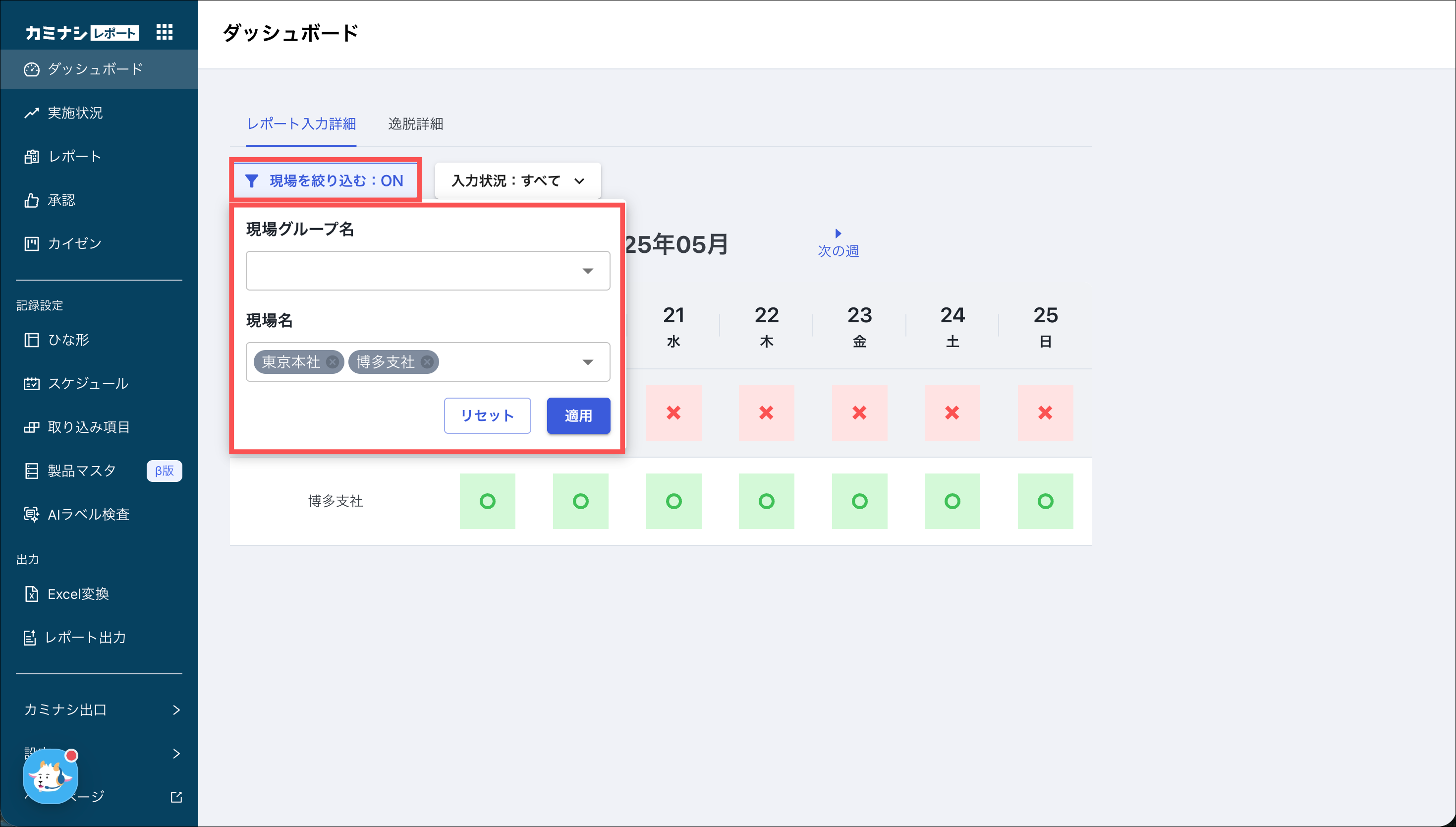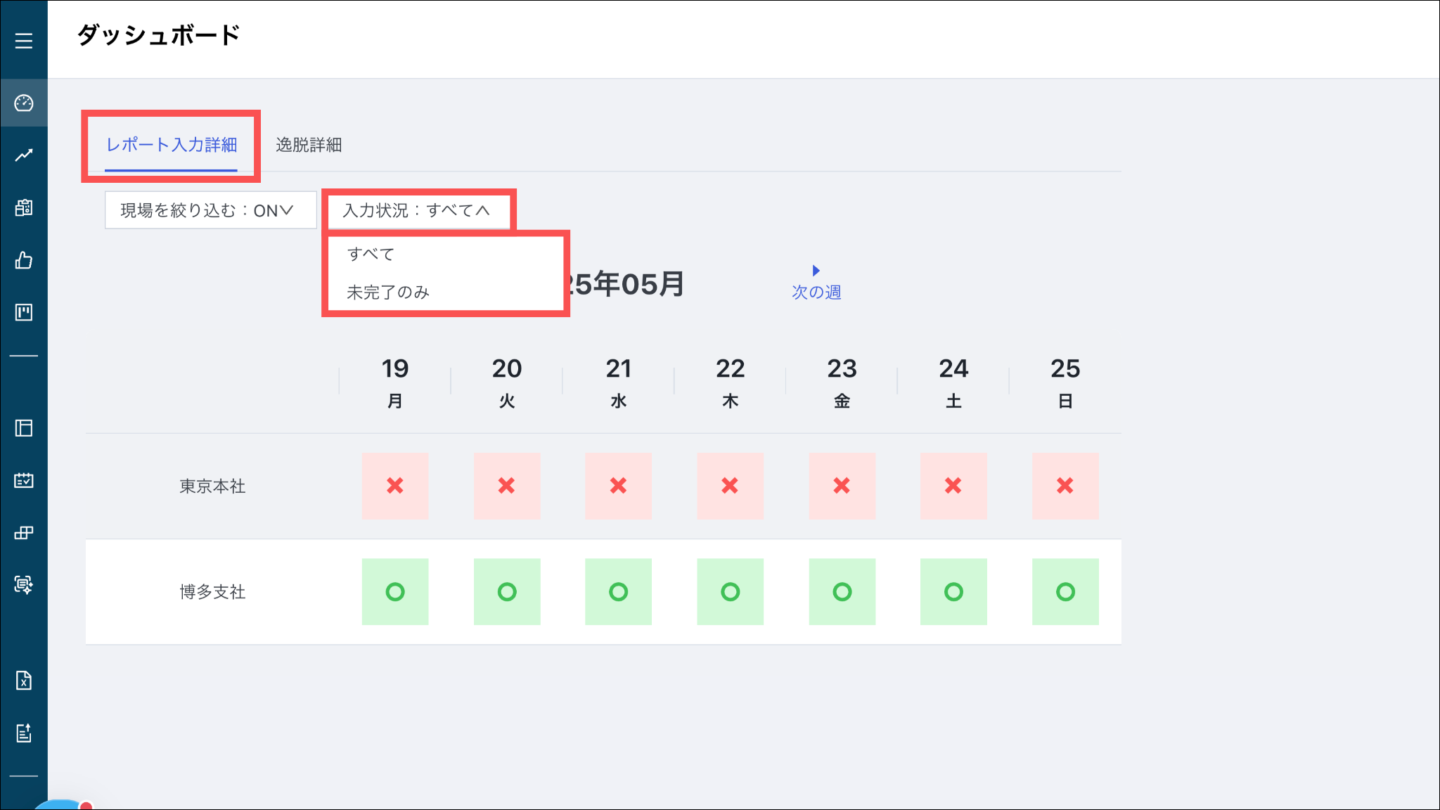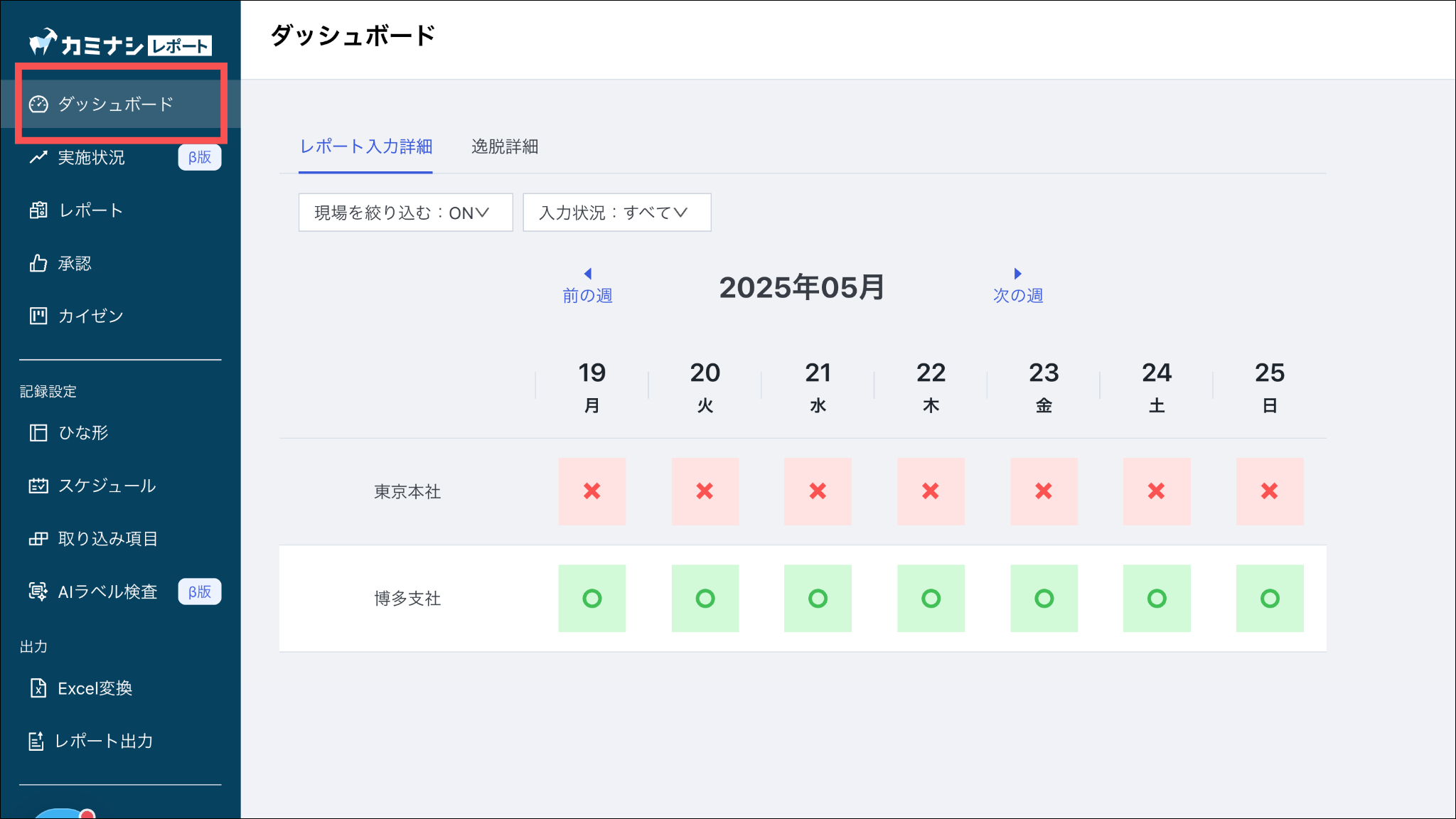 実施状況の「◯」を押すと、該当のレポート内容を確認することができます。