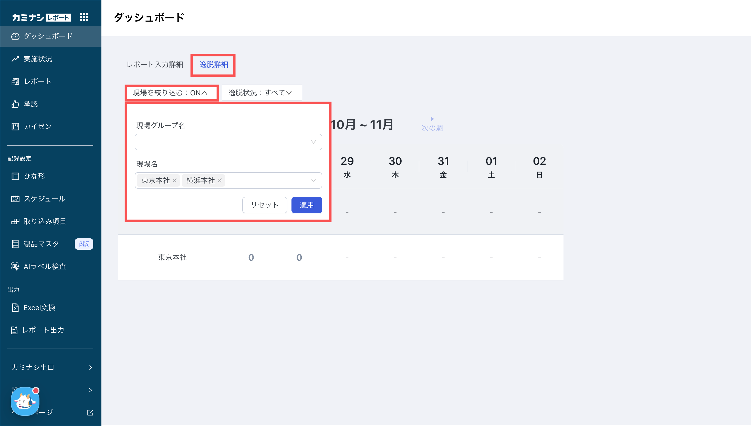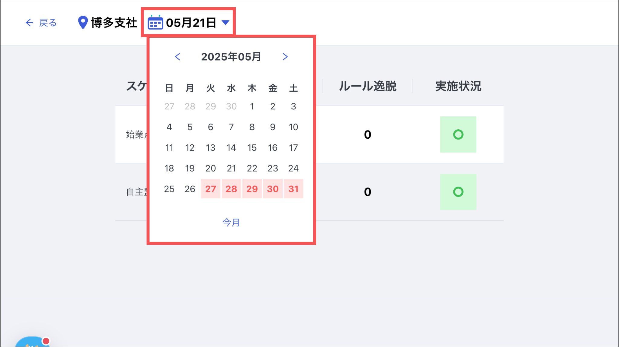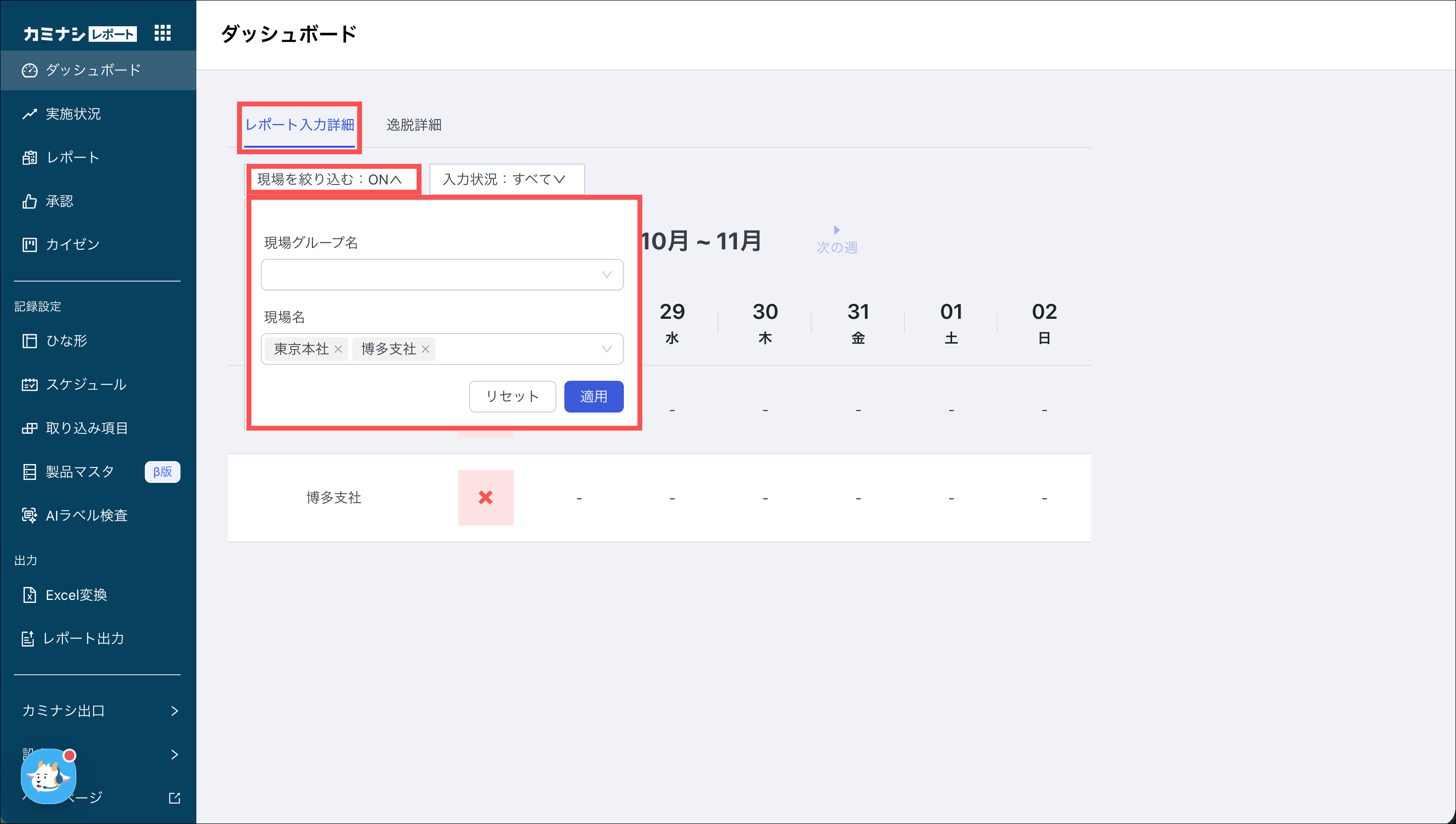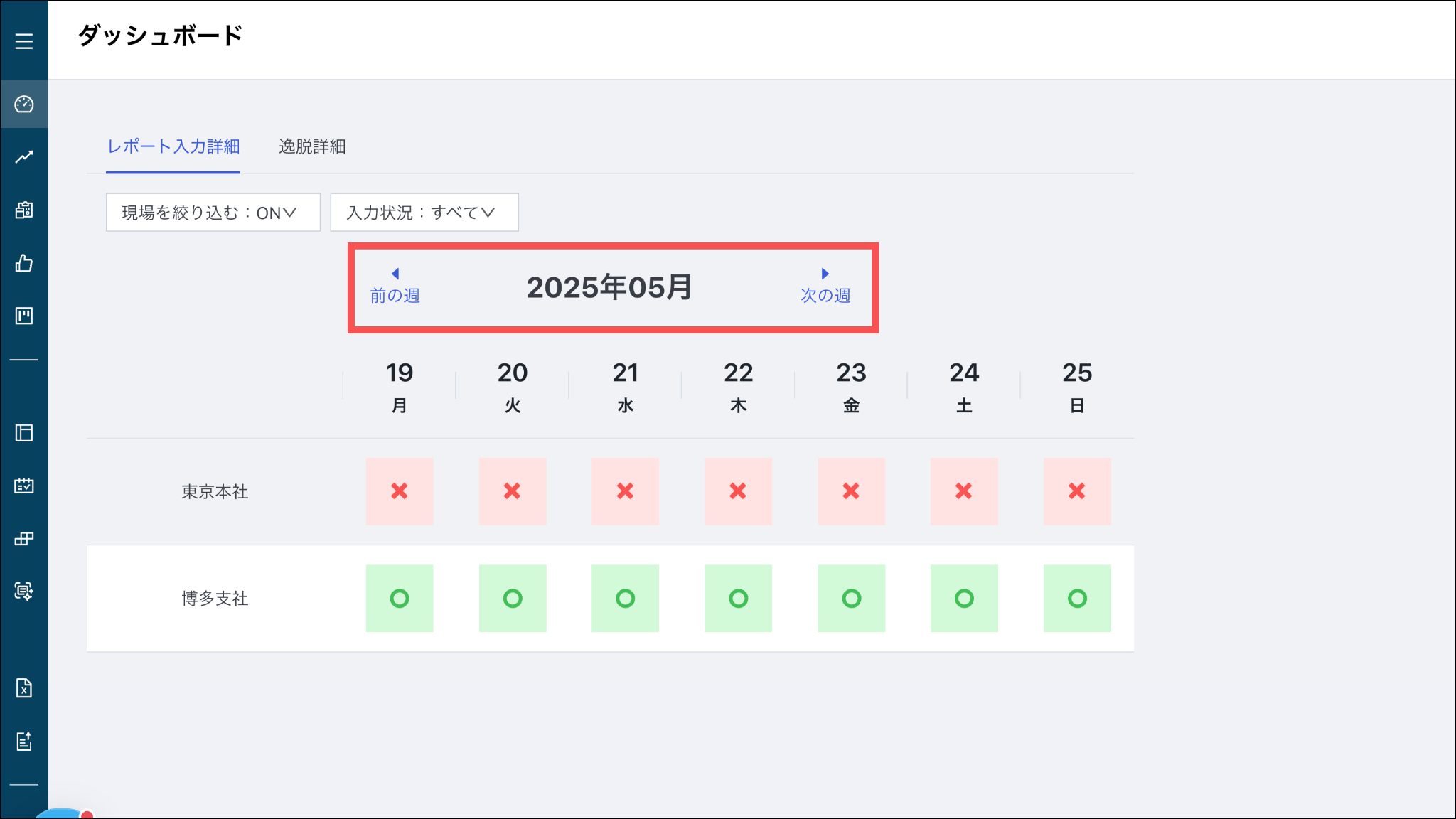 実施状況の「◯」を押すと、該当のレポート内容を確認することができます。