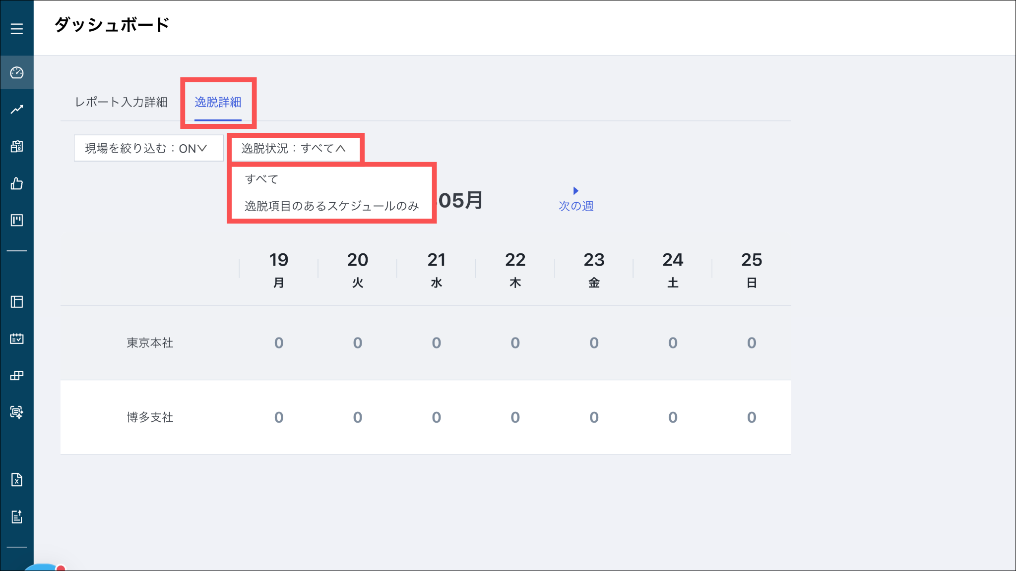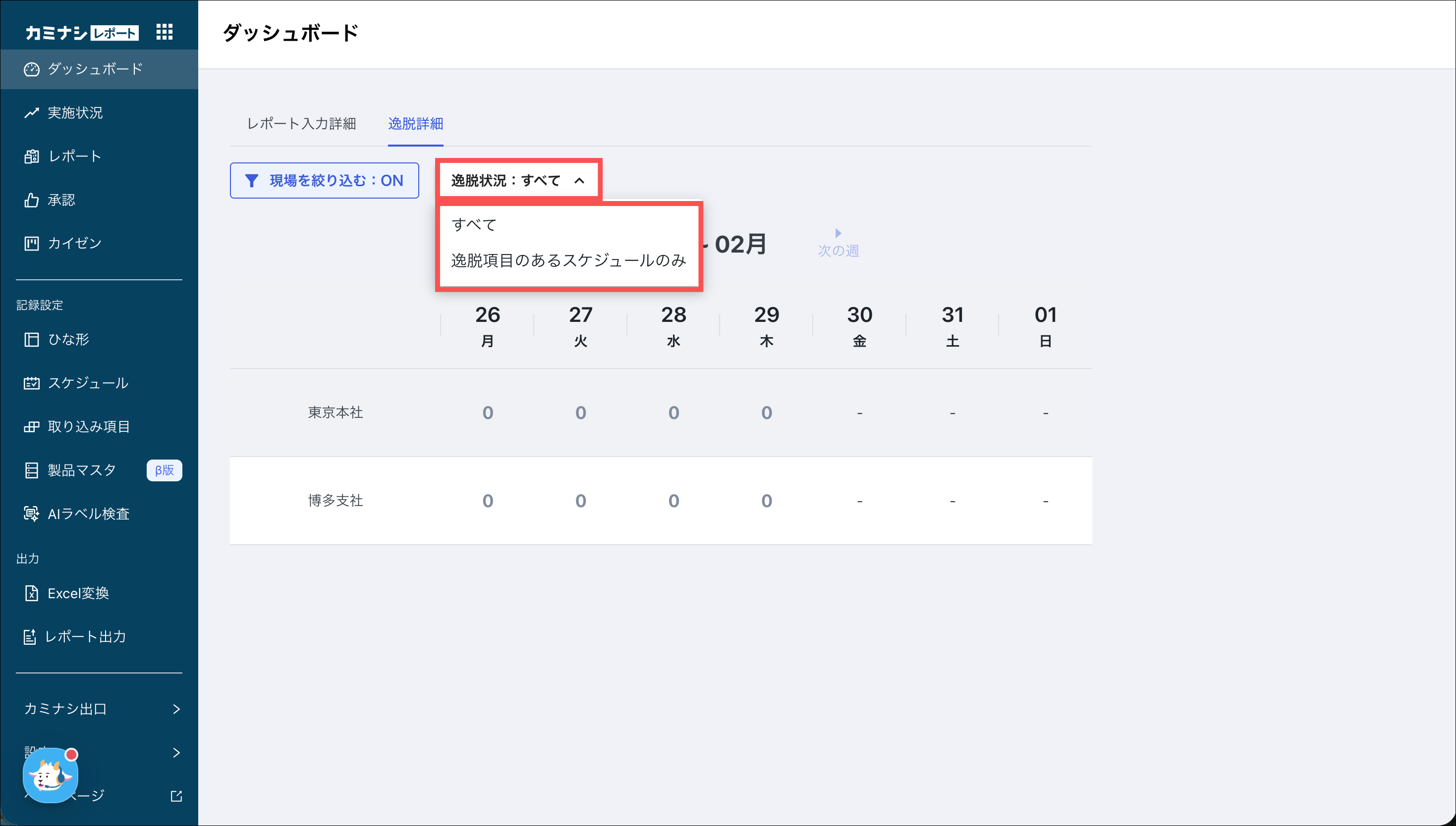 すべてのスケジュール、逸脱項目があるスケジュールのみを絞って検索することができます。