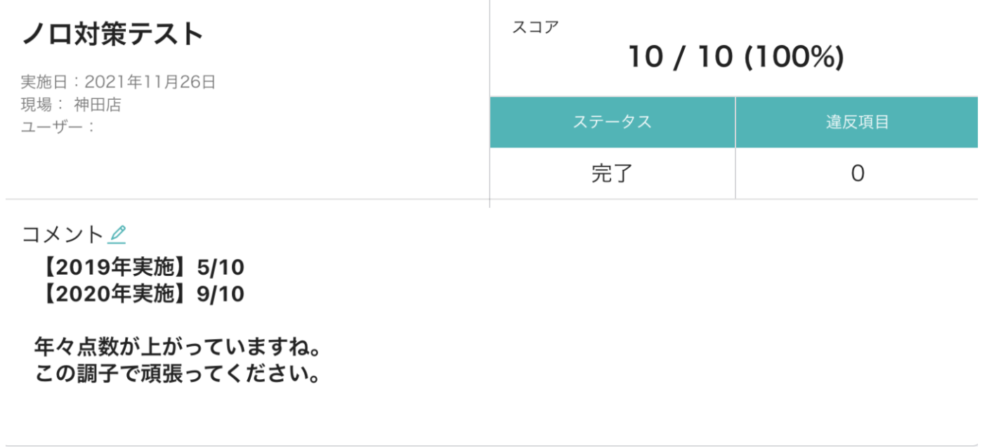レポートのコメント欄をメッセージ機能として、活用することも可能です。配点機能は、スコア化され、点数の%で表示されます。